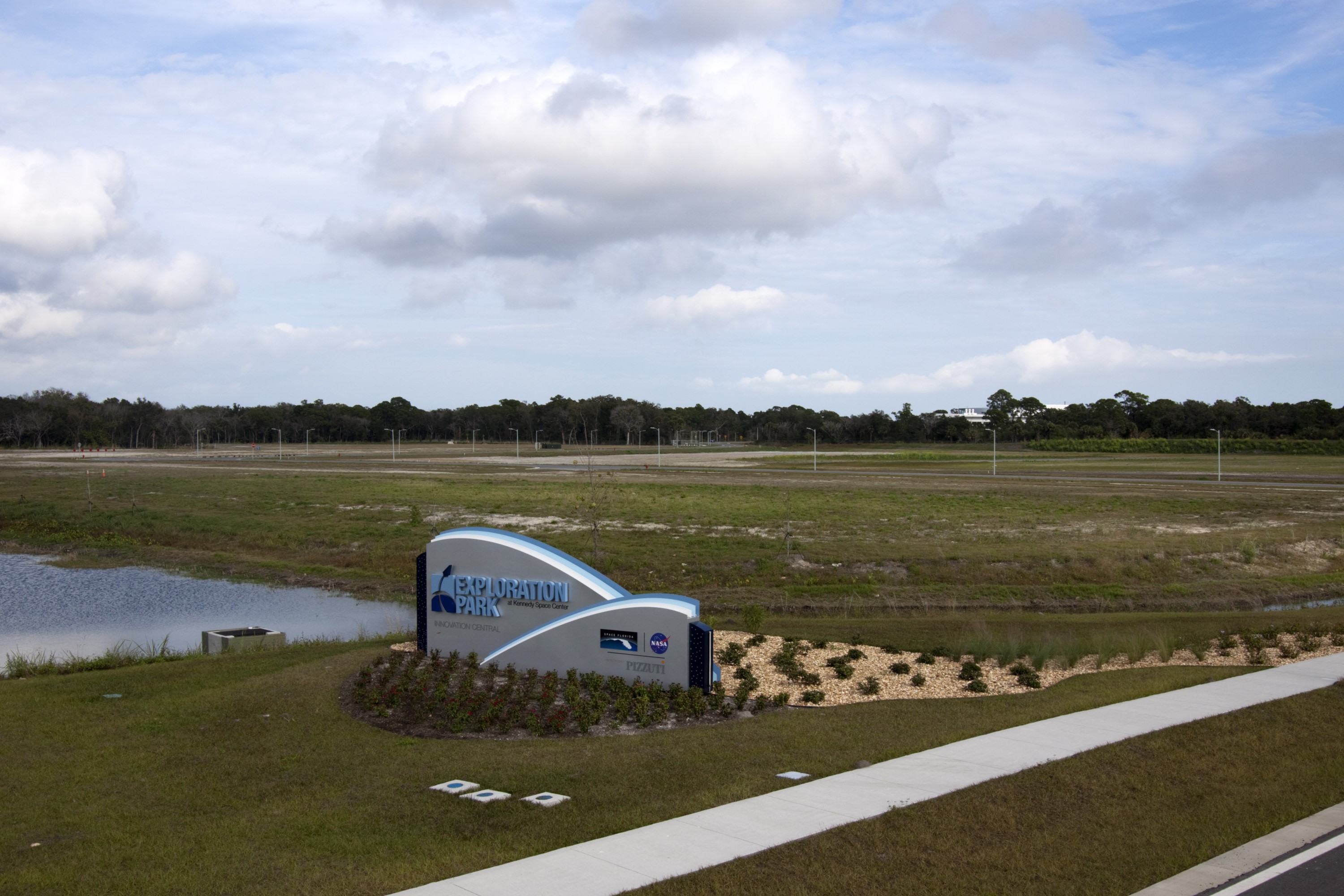 CAPE CANAVERAL, Fla. - A new sign on Space Commerce Way marks the entrance to Exploration Park near NASA’s Kennedy space Center in Florida. Land in the background has been cleared for the first phase of construction. Exploration Park encompasses 60 acres just outside Kennedy’s security gates. The park is designed to be a strategically located complex, adjacent to the Space Life Sciences Laboratory, for servicing diverse tenants and uses that will engage in activities to support the space-related activities of NASA, other government agencies and the U.S. commercial space industry. Its nine sustainable, state-of-the art buildings will include educational, office, research and laboratory, and high bay facilities and provide 350,000-square-feet of work space. Photo credit: NASA/Jim Grossmann
