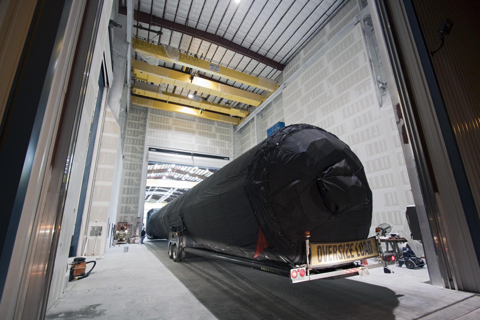 CAPE CANAVERAL, Fla. – A truck pulls the first stage of the Falcon 9 rocket inside the SpaceX Falcon Hangar at Launch Complex 40 on Cape Canaveral Air Force Station in Florida. The two-stage rocket will launch the company's Dragon spacecraft on the upcoming SpaceX CRS-2 mission. The flight will be the second commercial resupply mission to the International Space Station by Space Exploration Technologies, or SpaceX. NASA has contracted for a total of 12 commercial resupply flights from SpaceX and eight from the Orbital Sciences Corp. Photo credit: NASA/Jim Grossmann