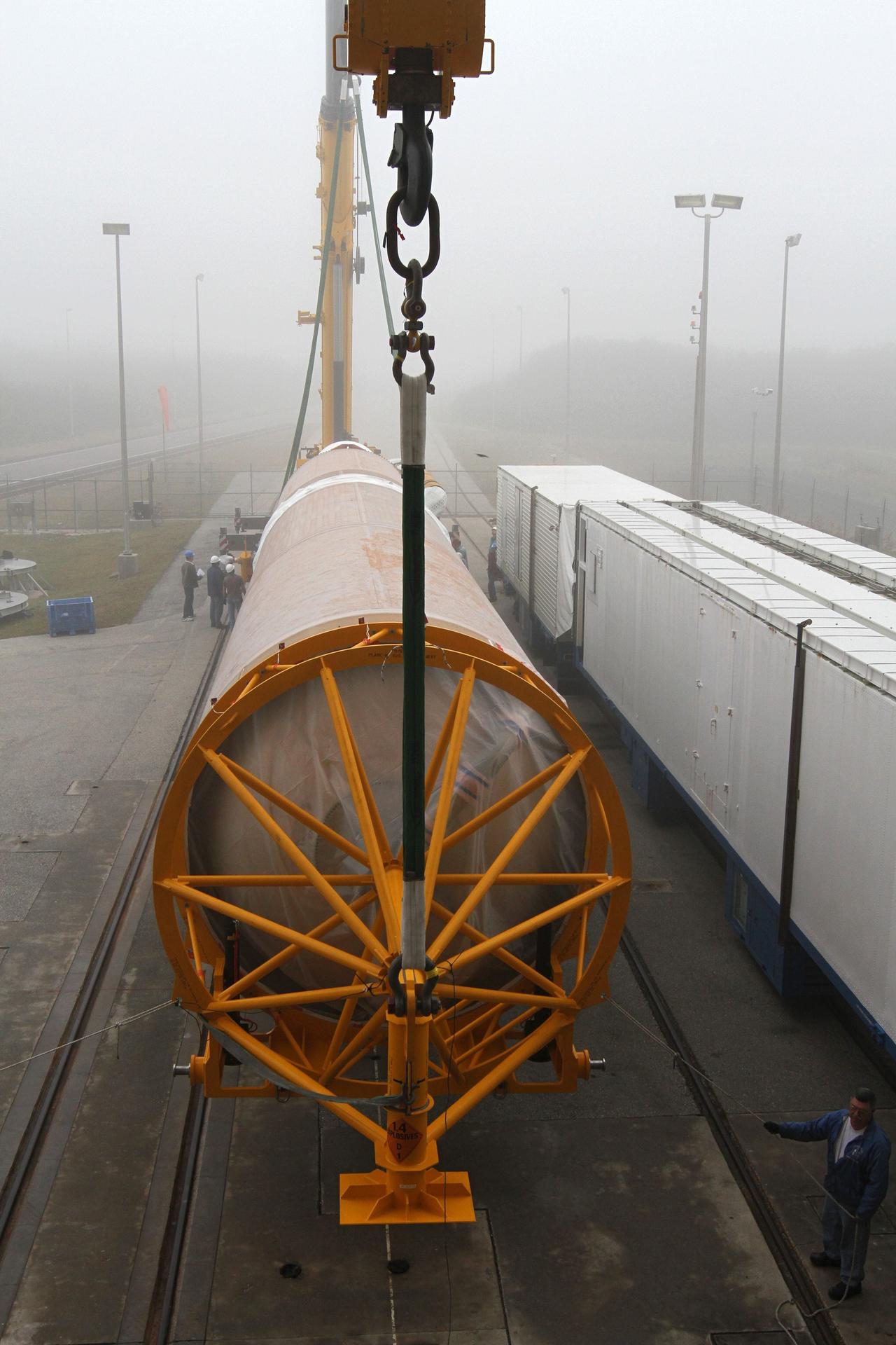 CAPE CANAVERAL, Fla. -- In the morning fog at Cape Canaveral Air Force Station's Space Launch Complex 41 in Florida, preparations are underway to erect the first stage of the Atlas V rocket that will carry the Tracking and Data Relay Satellite, TDRS-K, into orbit. Launch of the TDRS-K on the Atlas V rocket is planned for January 29, 2013. The TDRS-K spacecraft is part of the next-generation series in the Tracking and Data Relay Satellite System, a constellation of space-based communication satellites providing tracking, telemetry, command and high-bandwidth data return services. For more information, visit http://www.nasa.gov/mission_pages/tdrs/index.html Photo credit: NASA/ Ben Smegelsky