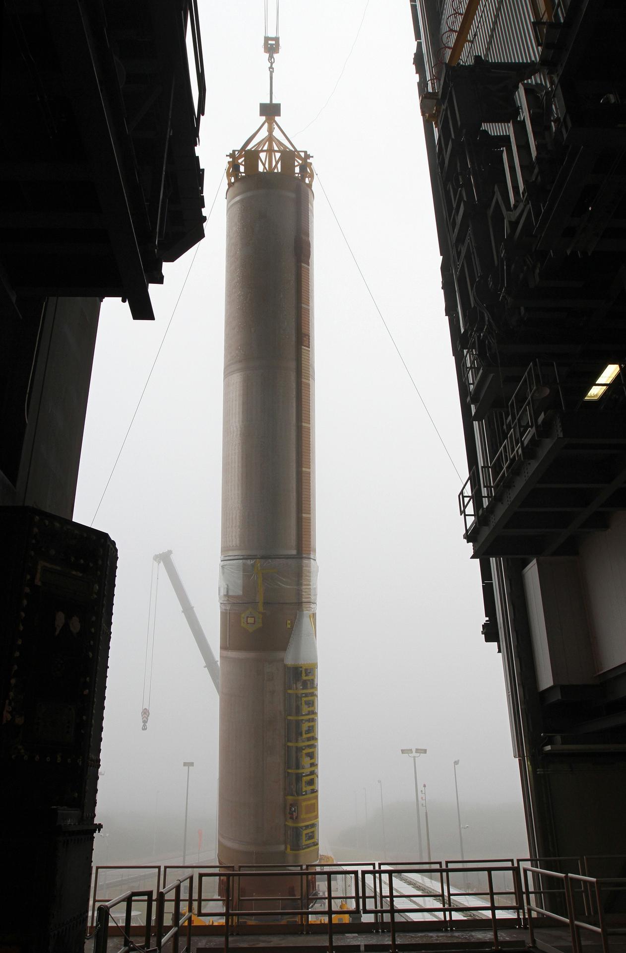 CAPE CANAVERAL, Fla. -- In the morning fog at Cape Canaveral Air Force Station's Space Launch Complex 41 in Florida, operations are underway to erect the first stage of the Atlas V rocket that will carry the Tracking and Data Relay Satellite, TDRS-K, into orbit. Launch of the TDRS-K on the Atlas V rocket is planned for January 29, 2013. The TDRS-K spacecraft is part of the next-generation series in the Tracking and Data Relay Satellite System, a constellation of space-based communication satellites providing tracking, telemetry, command and high-bandwidth data return services. For more information, visit http://www.nasa.gov/mission_pages/tdrs/index.html Photo credit: NASA/ Ben Smegelsky
