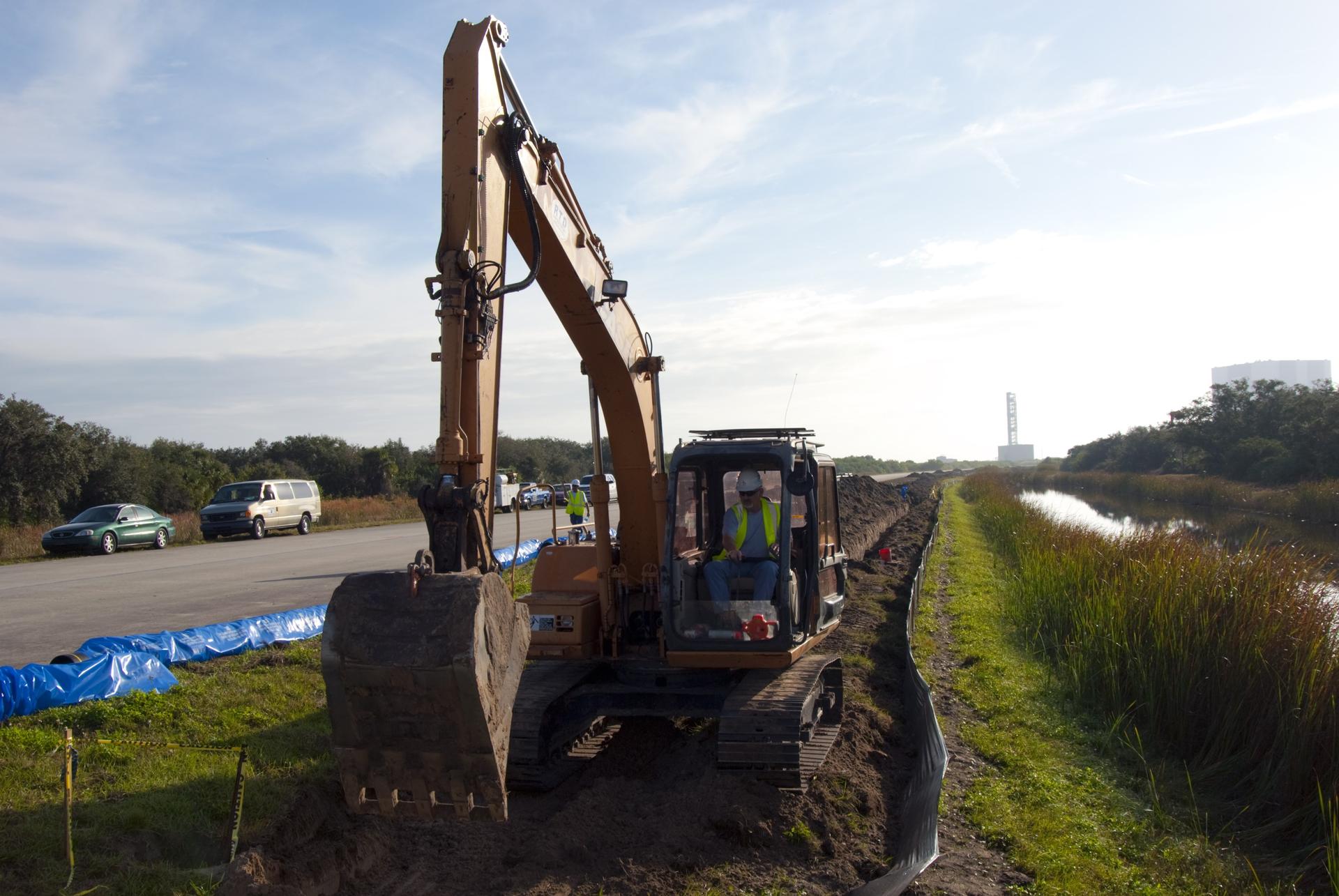 CAPE CANAVERAL, Fla. – At NASA’s Kennedy Space Center in Florida, a new 12-inch water main is being installed as part of a water/wastewater revitalizing plan. The main will provide water to the area around the shuttle landing facility's Landing Aids Control Building and fire station. NASA’s space shuttle runway is a unique national asset designed to enable the recovery of the agency’s fleet of space shuttle orbiters. The shuttle landing facility is a single, 15,000-foot long concrete runway oriented to the southeast and northwest. Air traffic control is provided from a control tower built to FAA standards. Fire and emergency response services are also available from an onsite facility. For more information, visit http://kscpartnerships.ksc.nasa.gov/slf.htm Photo credit: NASA/Tim Jacobs