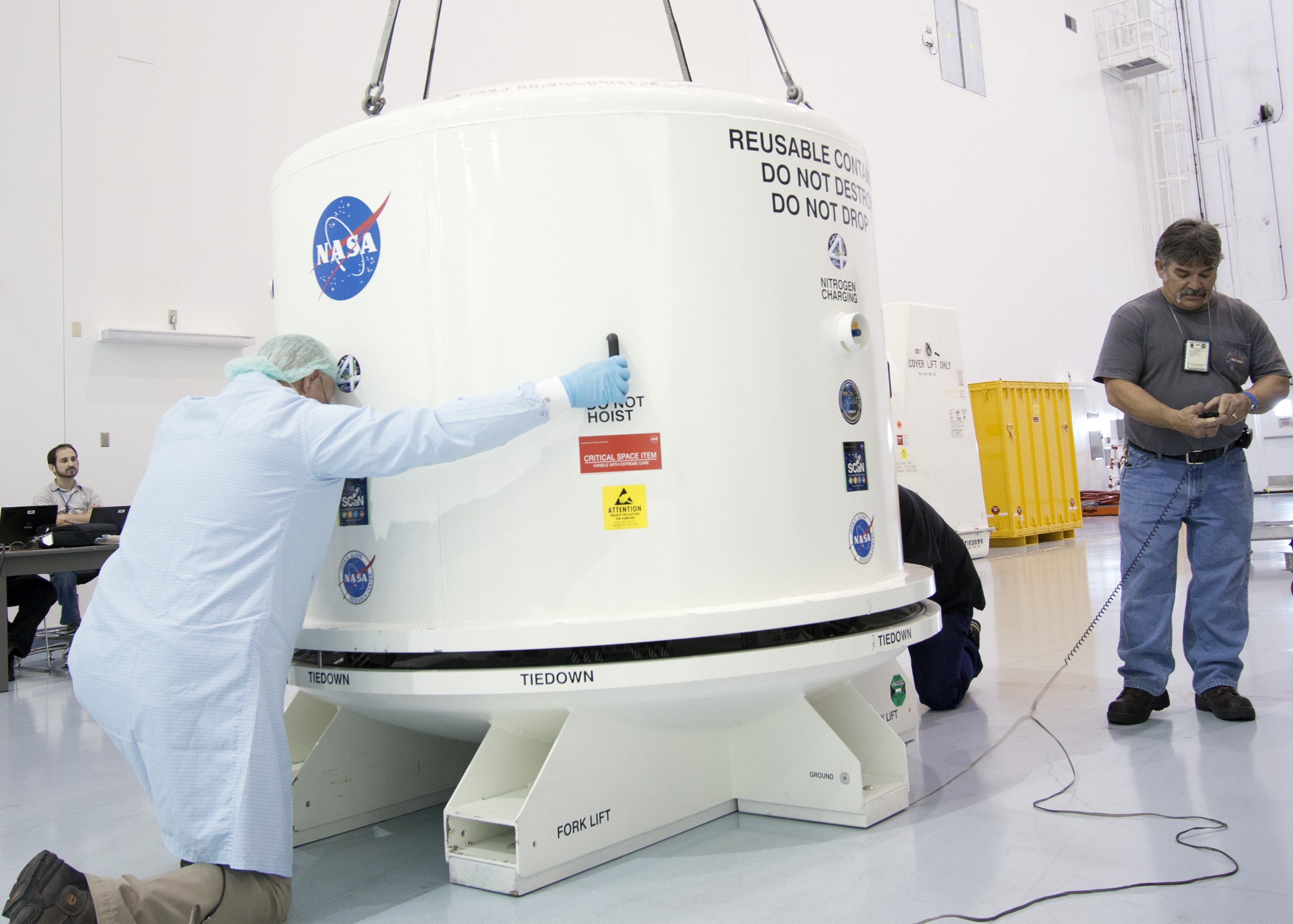 CAPE CANAVERAL, Fla. -- Inside the Space Station Processing Facility at NASA's Kennedy Space Center in Florida, technicians install the cover of the shipping container enclosing the Space Test Program-Houston 4 experiment. The experiment is one of the payloads processed at Kennedy that will be flown to Japan for the HTV-4 launch to the station, which is currently scheduled for this summer. Photo credit: NASA/Jim Grossmann