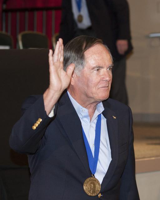 CAPE CANAVERAL, Fla. – U.S. Astronaut Hall of Fame member Bob Crippen is introduced at NASA’s Kennedy Space Center Visitor Complex in Florida, prior to the ceremony in which Bonnie Dunbar, Curt Brown and Eileen Collins will be inducted into the group of space pioneers. This induction is the twelfth group of space shuttle astronauts named to the AHOF, and the first time two women are inducted at the same time. The year’s inductees were selected by a committee of current Hall of Fame astronauts, former NASA officials, historians and journalists. The selection process is administered by the Astronaut Scholarship Foundation. For more on the U.S. Astronaut Hall of Fame, go to http://www.kennedyspacecenter.com/astronaut-hall-of-fame.aspx For more on the Astronaut Scholarship Foundation, go to http://astronautscholarship.org/ Photo credit: NASA/ Kim Shiflett