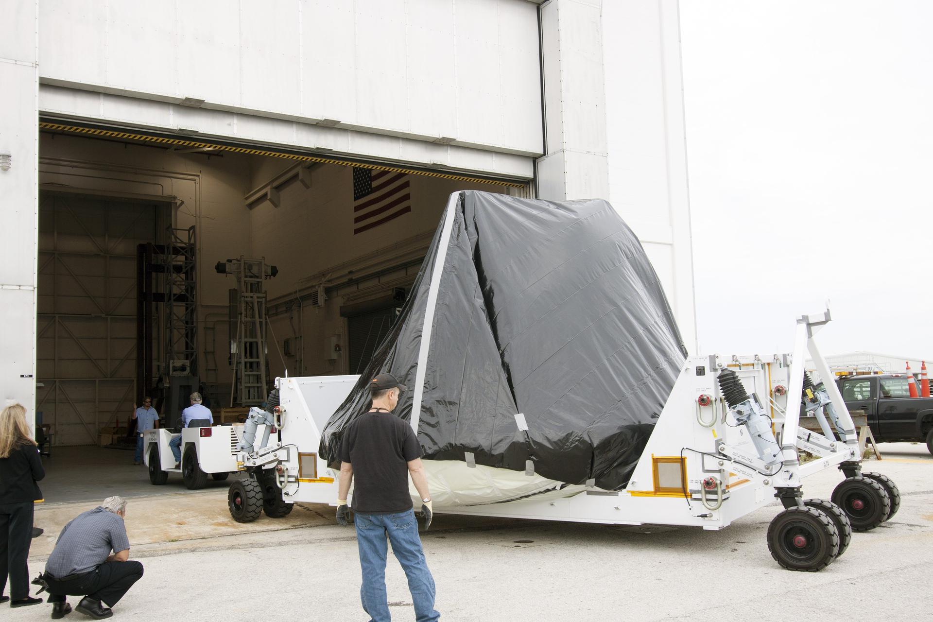 CAPE CANAVERAL, Fla. -- At NASA’s Kennedy Space Center in Florida, workers move the Orion ground test vehicle, or GTA, into the Launch Equipment Test Facility, or LETF, from the Operations and Checkout Building. At the LETF, Lockheed Martin will put the GTA through a series of pyrotechnic bolt tests. The ground test vehicle is being used for path finding operations in the O&C, including simulated manufacturing and assembly procedures. Launching atop NASA's heavy-lift Space Launch System SLS, which also is under development, the Orion Multi-Purpose Crew Vehicle MPCV will serve as the exploration vehicle that will carry astronaut crews beyond low Earth orbit. It also will provide emergency abort capabilities, sustain the crew during space travel and provide safe re-entry from deep space return velocities. For more information, visit www.nasa.gov/orion. Photo credit: Jim Grossman