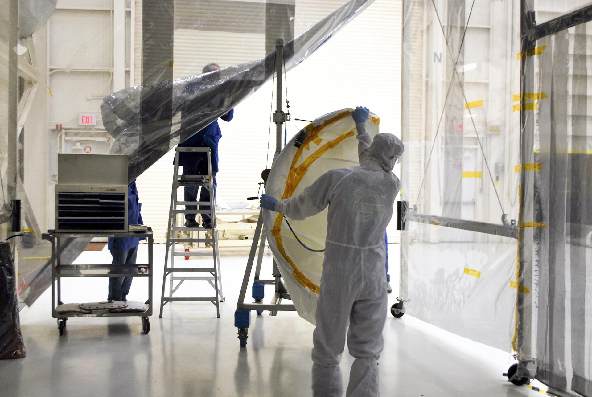 VANDENBERG AFB – Engineers move the port side of the payload fairing before it is connected into place for NASA's IRIS spacecraft. The fairing connects to the nose of the Orbital Sciences Pegasus XL rocket that will lift the solar observatory into orbit in June. The work is taking place in a hangar at Vandenberg Air Force Base where IRIS, short for Interface Region Imaging Spectrograph, is being prepared for launch on a Pegasus XL rocket. Scheduled for launch from Vandenberg June 26, IRIS will open a new window of discovery by tracing the flow of energy and plasma through the chromospheres and transition region into the sun’s corona using spectrometry and imaging. IRIS fills a crucial gap in our ability to advance studies of the sun-to-Earth connection by tracing the flow of energy and plasma through the foundation of the corona and the region around the sun known as the heliosphere. Photo credit: NASA/Randy Beaudoin