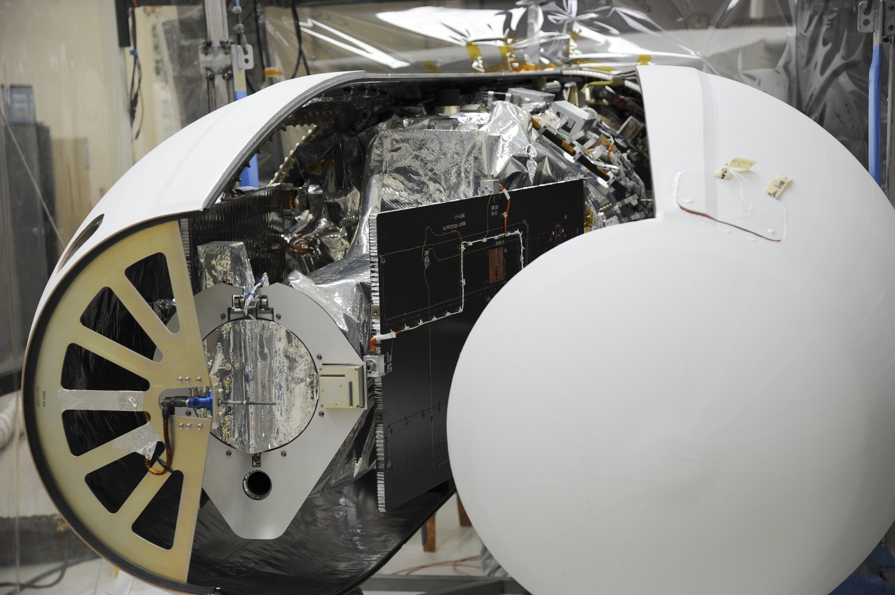 VANDENBERG AFB – Orbital Sciences team members move the second half of the payload fairing before it is placed over NASA's IRIS spacecraft. The fairing connects to the nose of the Orbital Sciences Pegasus XL rocket that will lift the solar observatory into orbit in June. The work is taking place in a hangar at Vandenberg Air Force Base where IRIS, short for Interface Region Imaging Spectrograph, is being prepared for launch on a Pegasus XL rocket. Scheduled for launch from Vandenberg June 26, IRIS will open a new window of discovery by tracing the flow of energy and plasma through the chromospheres and transition region into the sun’s corona using spectrometry and imaging. IRIS fills a crucial gap in our ability to advance studies of the sun-to-Earth connection by tracing the flow of energy and plasma through the foundation of the corona and the region around the sun known as the heliosphere. Photo credit: NASA/Tony Vauclin