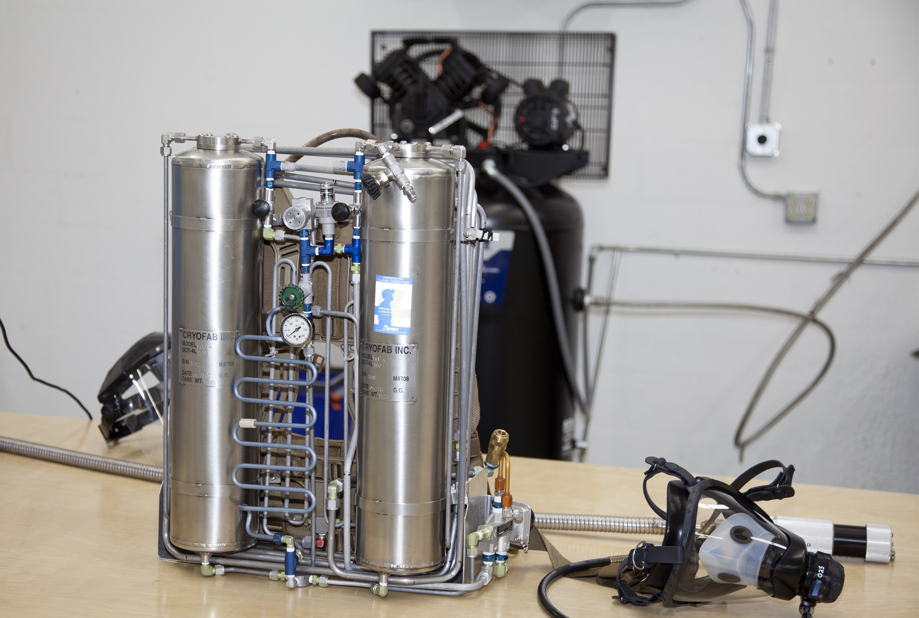 TITUSVILLE, Fla. - A small liquid-air filled backpack called CryoBA, short for Cryogenic Breathing Apparatus, is on display at BCS Life Support in Titusville, Fla. The CryoBA and a larger Cryogenic Refuge Alternative Supply System, or CryoRASS, are being developed by a NASA Kennedy Space Center engineering team in collaboration with The National Institute for Occupational Safety and Health to provide miners with twice the amount of breathable and cooler air than traditional compressed systems. The technology also could be used for commercial applications, such as fire and military rescue operations, as well as NASA's future human spaceflight missions. Photo credit: NASA/Daniel Casper