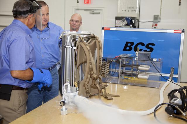 TITUSVILLE, Fla. - Representatives from NASA Kennedy Space Center, BCS Life Support, LabTech and URS prepare to demo a Cryogenic Refuge Alternative Supply System, or CryoRASS, and a smaller liquid-air filled backpack called CryoBA, short for Cryogenic Breathing Apparatus, in Titusville, Fla. The two systems are being developed by a Kennedy engineering team in collaboration with The National Institute for Occupational Safety and Health to provide miners with twice the amount of breathable and cooler air than traditional compressed systems. The technology also could be used for commercial applications, such as fire and military rescue operations, as well as NASA's future human spaceflight missions. Photo credit: NASA/Daniel Casper
