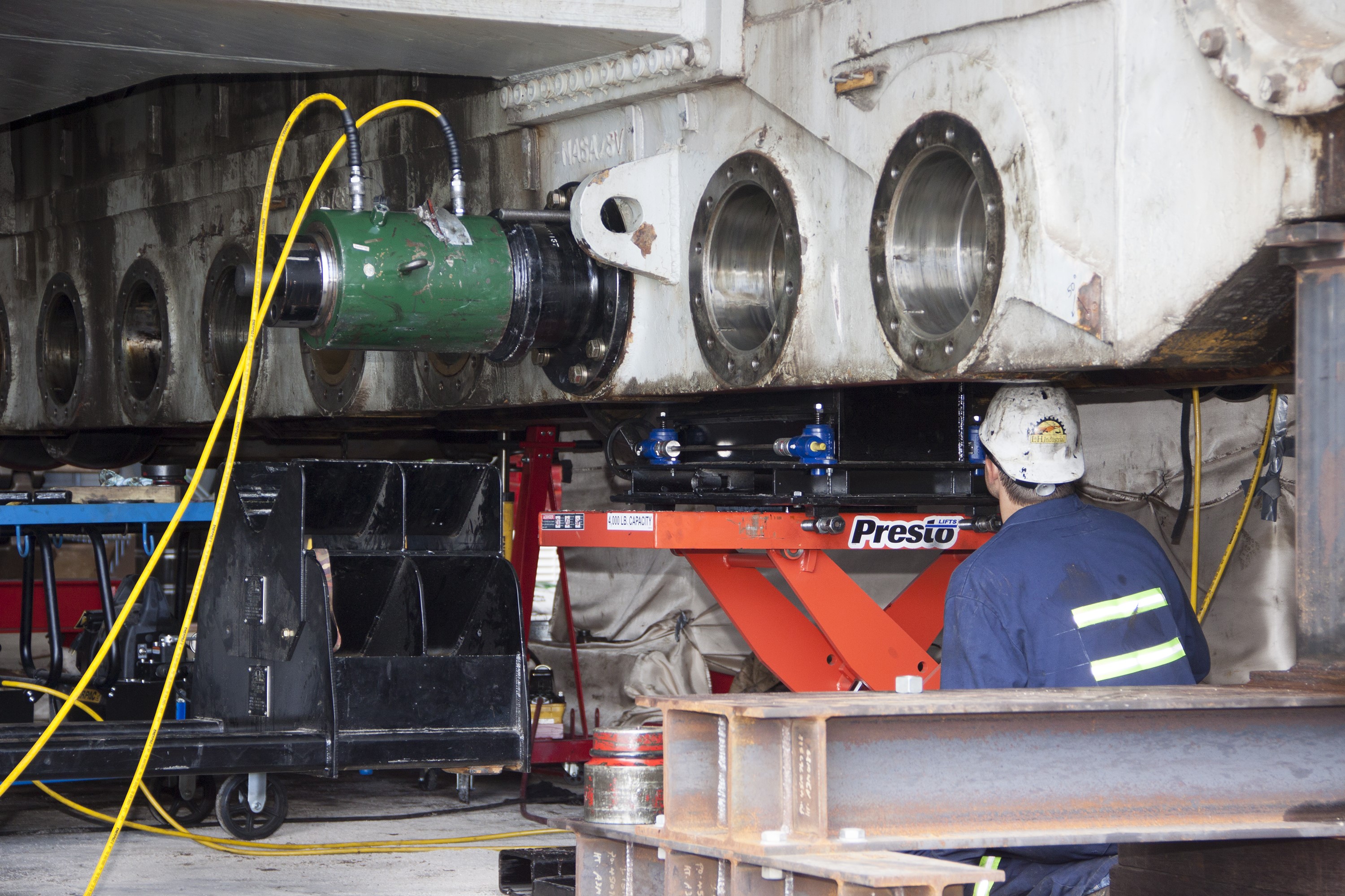 CAPE CANAVERAL, Fla. – Inside the Vehicle Assembly Building at NASA’s Kennedy Space Center in Florida, a technician monitors the progress as a new roller shaft bearing is being preparing for installation in crawler-transporter 2, or CT-2. Work continues in high bay 2 to upgrade CT-2. The modifications are designed to ensure CT-2’s ability to transport launch vehicles currently in development, such as the agency’s Space Launch System, to the launch pad. The Ground Systems Development and Operations Program office at Kennedy is overseeing the upgrades. For more than 45 years the crawler-transporters were used to transport the mobile launcher platform and the Apollo-Saturn V rockets and, later, space shuttles to Launch Pads 39A and B. For more information, visit: http://www.nasa.gov/exploration/systems/ground/crawler-transporter_bearings.html. Photo credit: NASA/Jim Grossmann