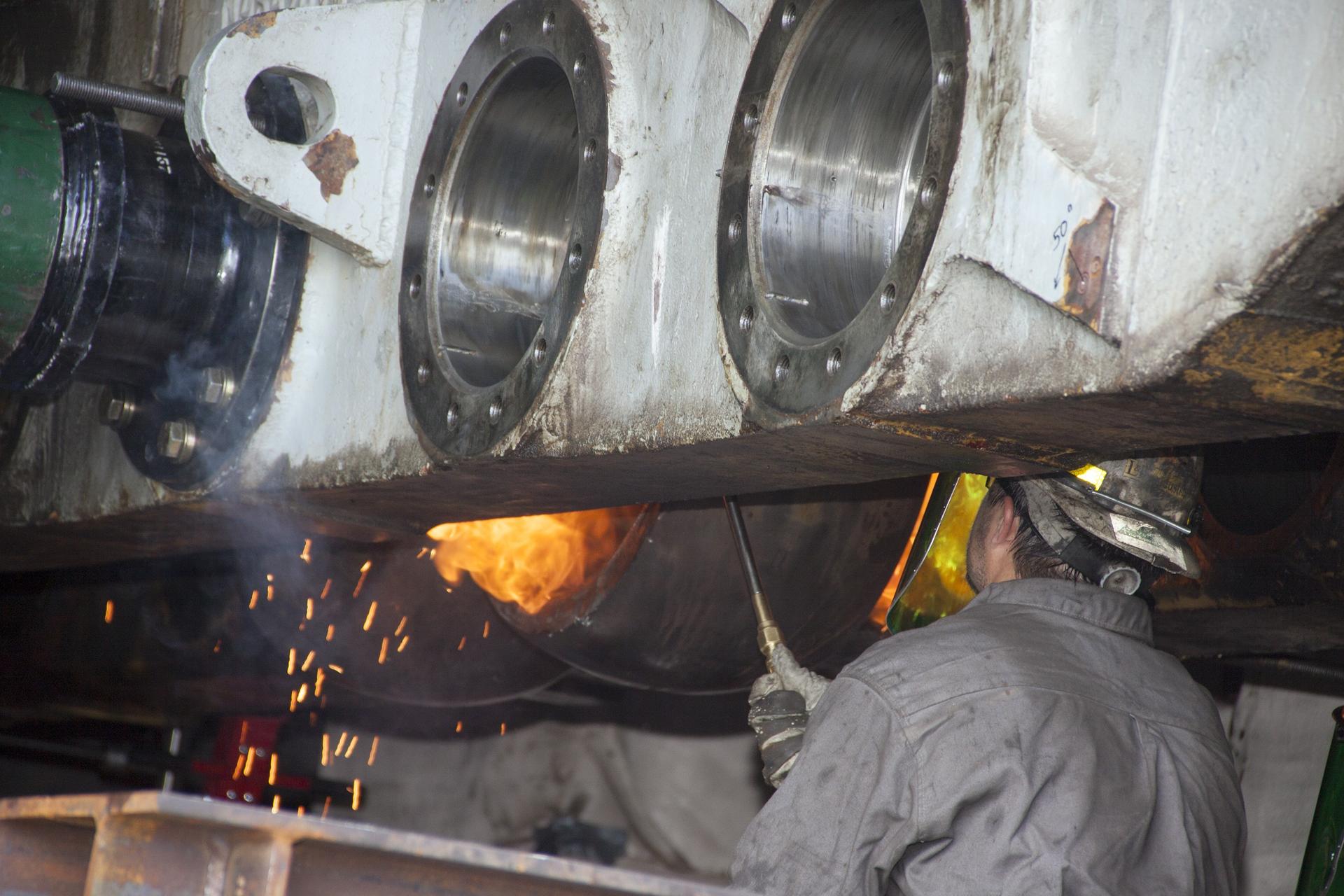 CAPE CANAVERAL, Fla. – Inside the Vehicle Assembly Building at NASA’s Kennedy Space Center in Florida, a technician performs welding in the bearing assembly area of crawler-transporter 2, or CT-2. New roller shaft bearings assemblies are being installed. Work continues in high bay 2 to upgrade CT-2. The modifications are designed to ensure CT-2’s ability to transport launch vehicles currently in development, such as the agency’s Space Launch System, to the launch pad. The Ground Systems Development and Operations Program office at Kennedy is overseeing the upgrades. For more than 45 years the crawler-transporters were used to transport the mobile launcher platform and the Apollo-Saturn V rockets and, later, space shuttles to Launch Pads 39A and B. For more information, visit: http://www.nasa.gov/exploration/systems/ground/crawler-transporter_bearings.html. Photo credit: NASA/Jim Grossmann