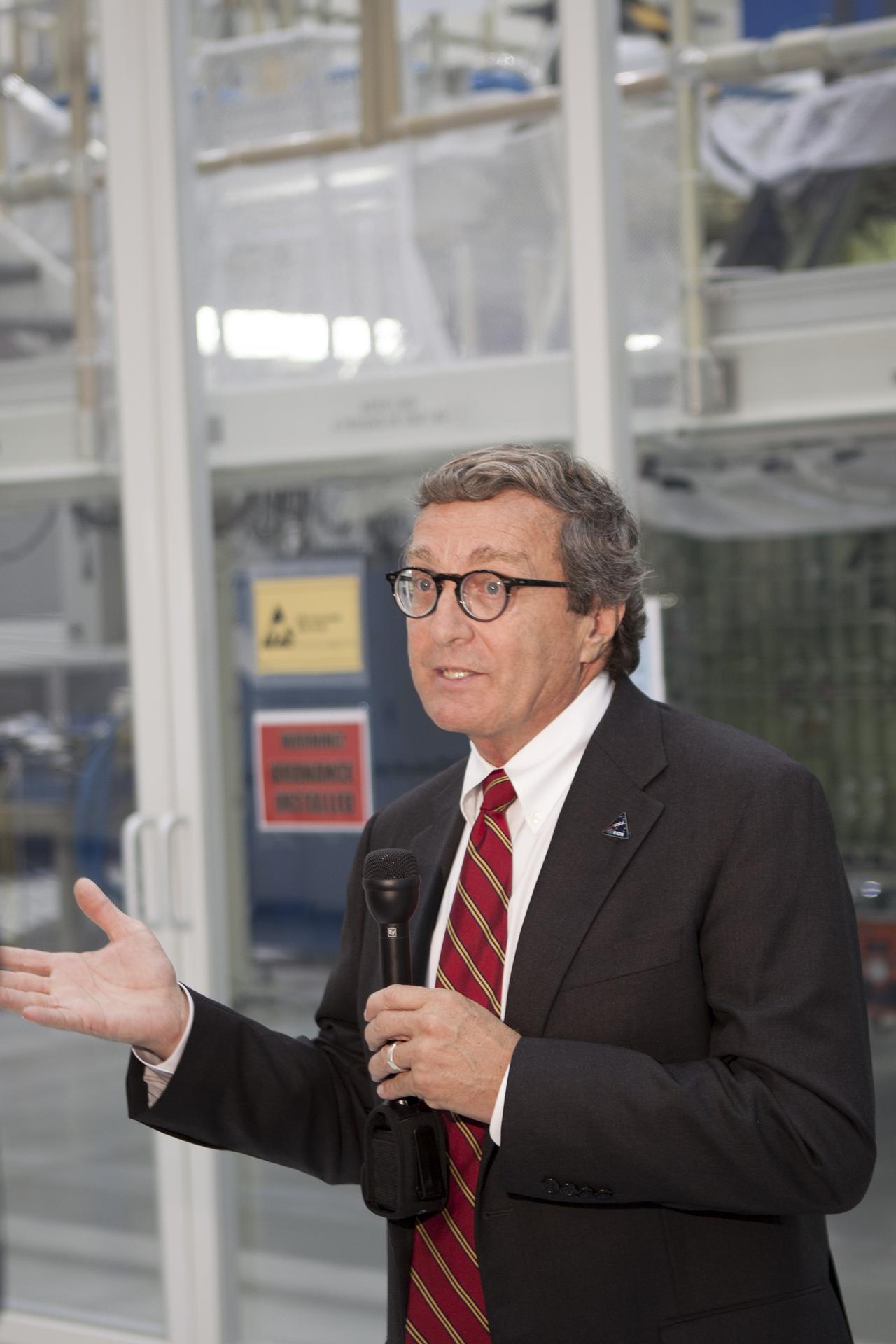 CAPE CANAVERAL, Fla. – Inside the Operations and Checkout Building high bay at NASA’s Kennedy Space Center in Florida, members of the media receive an on activities in NASA’s Ground Systems Development and Operations, or GSDO, Program, Space Launch System and Orion crew module for Exploration Test Flight 1. Speaking to the media is Larry Price, Lockheed Martin deputy program manager for Orion. Orion is the exploration spacecraft designed to carry crews to space beyond low Earth orbit. It will provide emergency abort capability, sustain the crew during the space travel and provide safe re-entry from deep space return velocities. Orion’s first unpiloted test flight is scheduled to launch in 2014 atop a Delta IV rocket. A second uncrewed flight test is scheduled for 2017 on NASA’s Space Launch System rocket. For more information, visit http://www.nasa.gov/orion. Photo credit: NASA/Jim Grossmann
