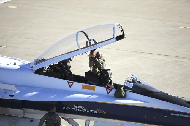 VANDENBERG AIR FORCE BASE, Calif. – Videographer Lori Losey boards an F-18 aircraft at Vandenberg Air Force Base in California. The F-18 "chase plane" will accompany the Orbital Sciences L-1011 aircraft as it transports the Pegasus XL rocket carrying NASA's Interface Region Imaging Spectrograph, or IRIS, solar observatory over the Pacific Ocean. Release of the rocket from under the wing of the L-1011 is scheduled for 10:27 p.m. EDT. IRIS will open a new window of discovery using spectrometry and imaging to trace the flow of energy and plasma through the chromospheres and transition region into the sun’s corona. The spacecraft will observe how solar material moves, gathers energy and heats up as it travels through a largely unexplored region of the solar atmosphere. This interface region, located between the sun's visible surface and its upper atmosphere, is where most of its ultraviolet emission is generated. These emissions impact the near-Earth space environment and Earth's climate. NASA's Launch Services Program at the agency's Kennedy Space Center in Florida is managing the countdown and launch. For more information, visit http://www.nasa.gov/iris. Photo credit: NASA/Daniel Casper