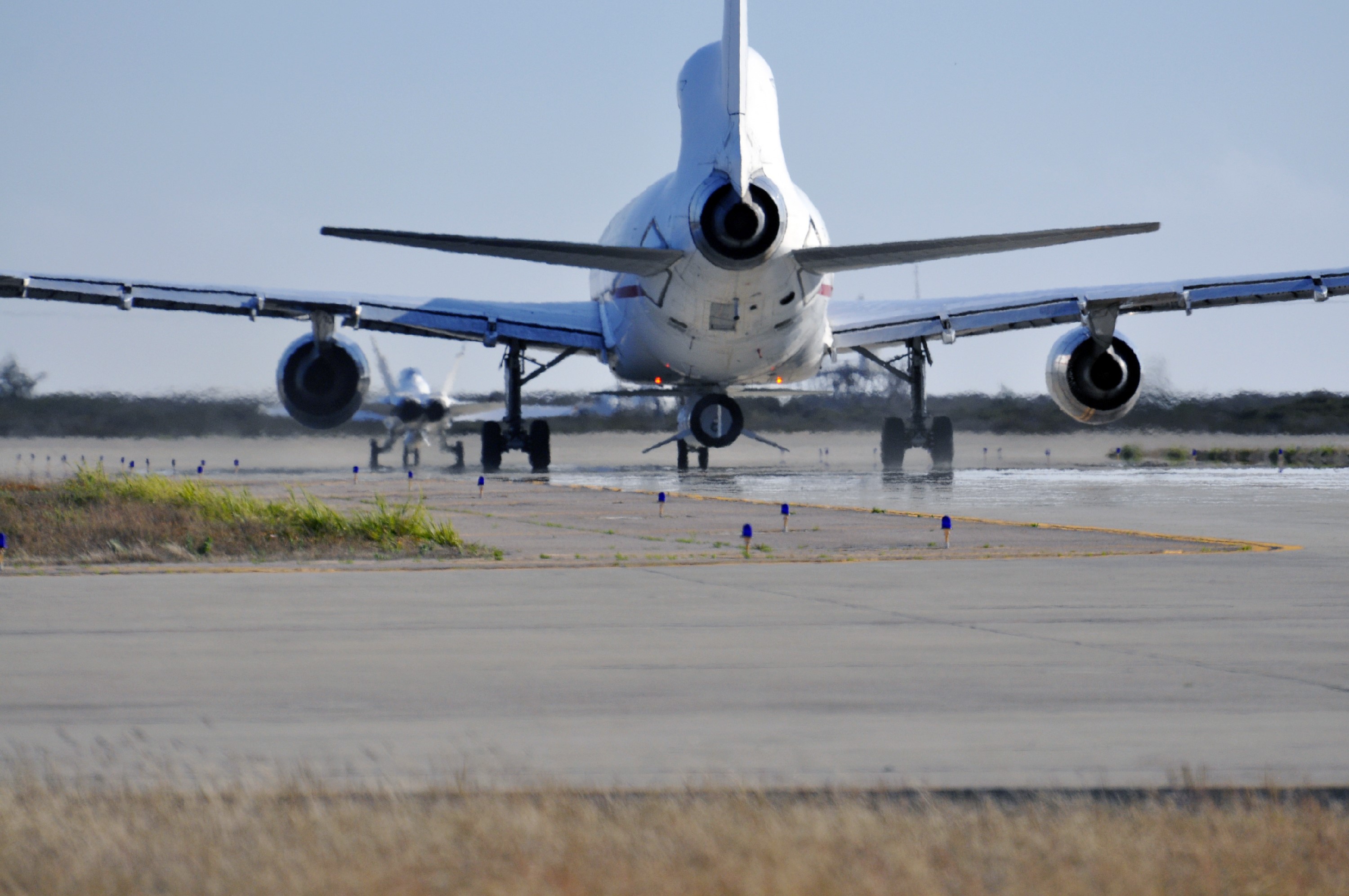 VANDENBERG AIR FORCE BASE, Calif. – A NASA F-18 and an Orbital Sciences L-1011 carrier aircraft taxi to the runway at Vandenberg Air Force Base, Calif., before taking off on a mission to launch NASA's IRIS spacecraft into low-Earth orbit. IRIS, short for Interface Region Imaging Spectrograph, was launched aboard an Orbital Sciences Pegasus XL rocket released from the L-1011. Photo credit: VAFB/ Randy Beaudoin
