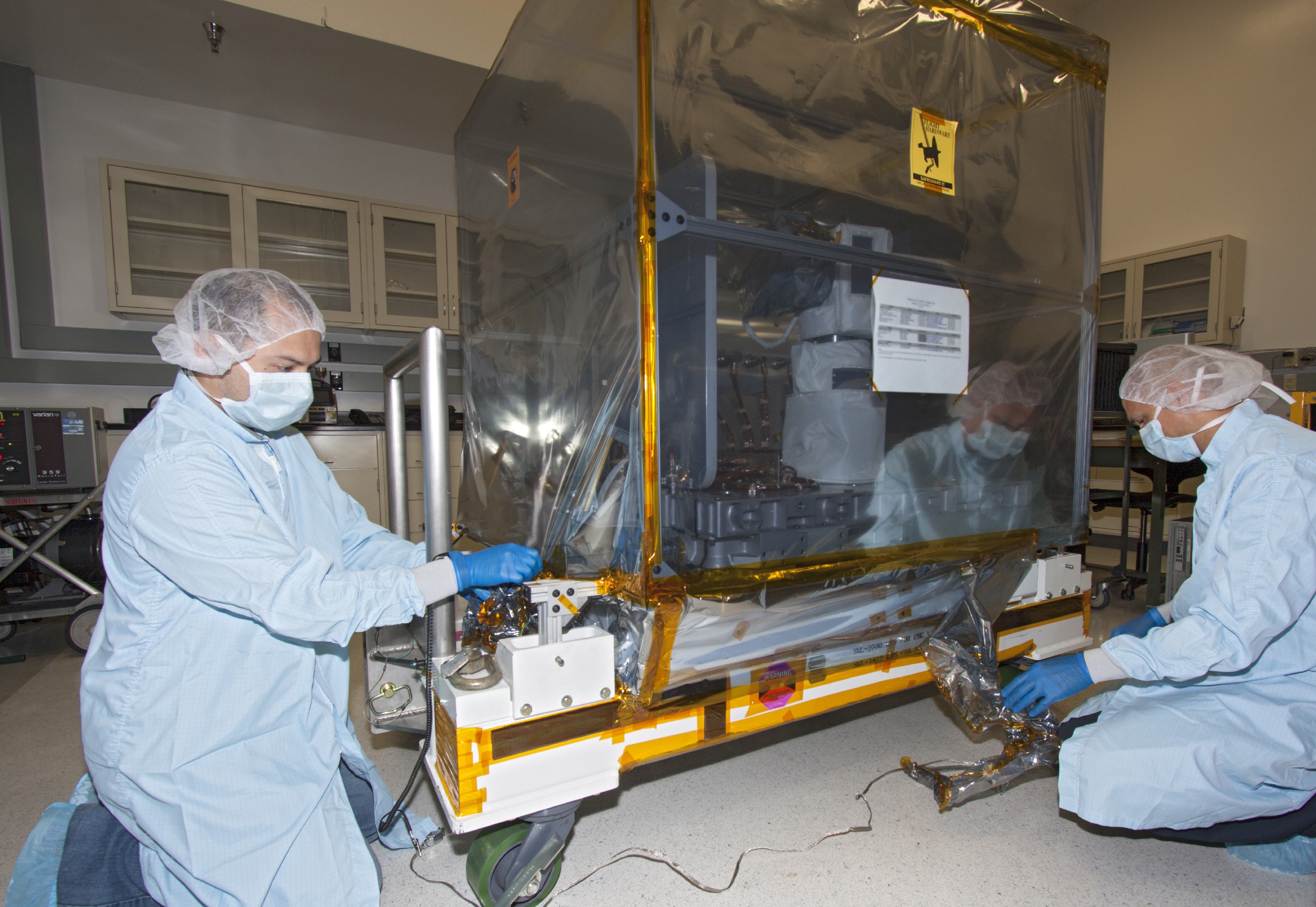 CAPE CANAVERAL, Fla. -- At NASA’s Kennedy Space Center in Florida, technicians prepare to uncover and check the Optical Payload for Lasercomm Science, or OPALS, experiment in a test cell at a Space Station Processing Facility offline laboratory. The optical technology demonstration experiment arrived from the agency’s Jet Propulsion Laboratory in Pasadena, Calif. NASA will use the International Space Station to test OPALS’ communications technology that could dramatically improve spacecraft communications, enhance commercial missions and strengthen transmission of scientific data. The experiment is slated to fly later this year aboard a SpaceX Dragon commercial resupply mission to the space station. The mission is expected to run 90 days after installation on the outside of the station. For more information about OPALS, visit: http://go.nasa.gov/10MMPDO. Photo credit: NASA/Jim Grossmann