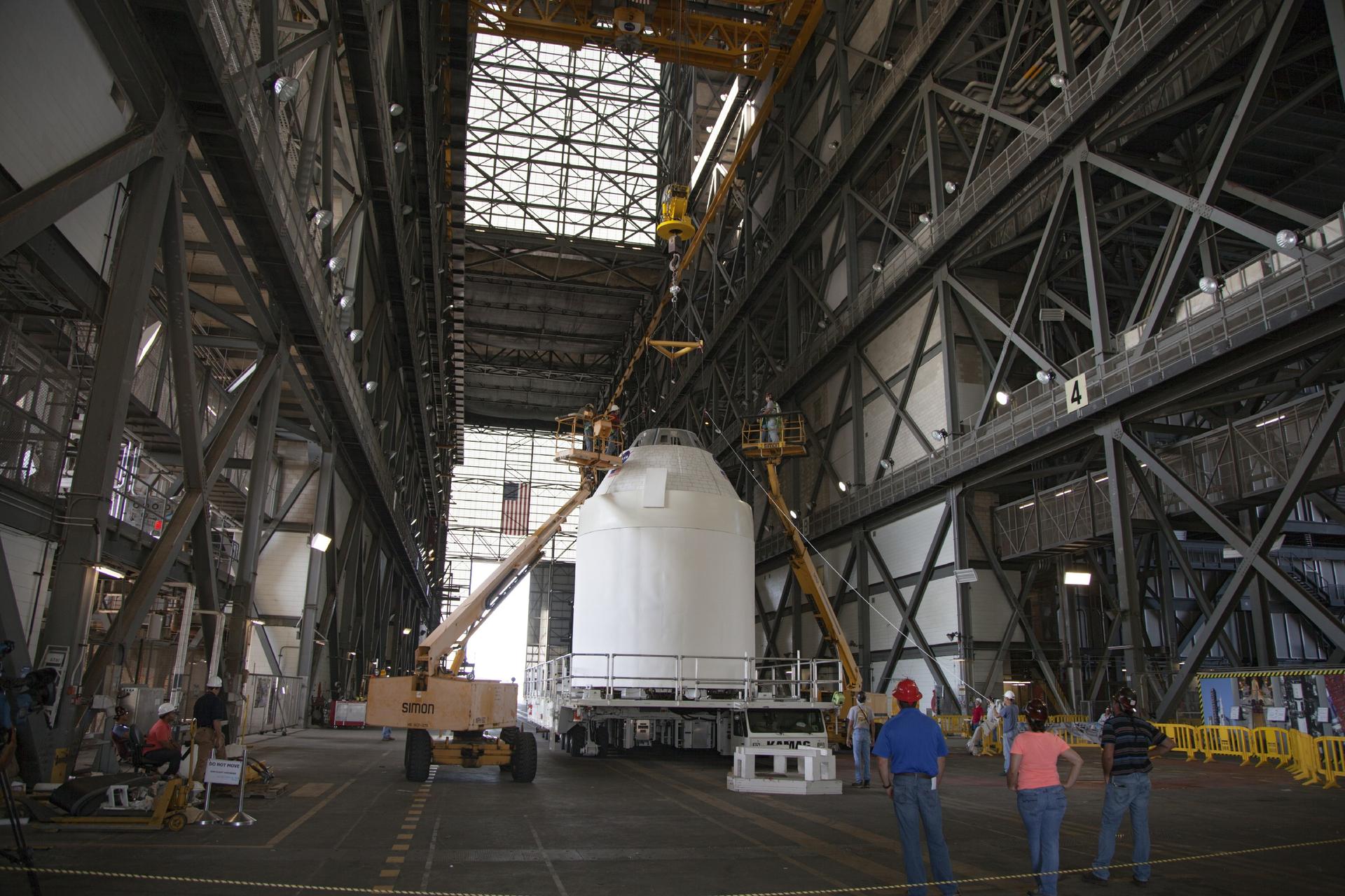 CAPE CANAVERAL, Fla. -- In the transfer aisle of the Vehicle Assembly Building at NASA’s Kennedy Space Center in Florida, a full-size mockup of the Orion spacecraft is being prepared for lifting into High Bay 4. Crane operators and technicians practice stacking and de-stacking operations in order to keep processing procedures and skills current for the Ground Systems Development and Operations Program. Orion is the exploration spacecraft designed to carry crews to space beyond low Earth orbit. It will provide emergency abort capability, sustain the crew during the space travel and provide safe re-entry from deep space return velocities. Orion’s first unpiloted test flight is scheduled to launch in 2014 atop a Delta IV rocket. A second uncrewed flight test is scheduled for 2017 on NASA’s Space Launch System rocket. For more information, visit http://www.nasa.gov/orion. Photo credit: NASA/Dan Casper