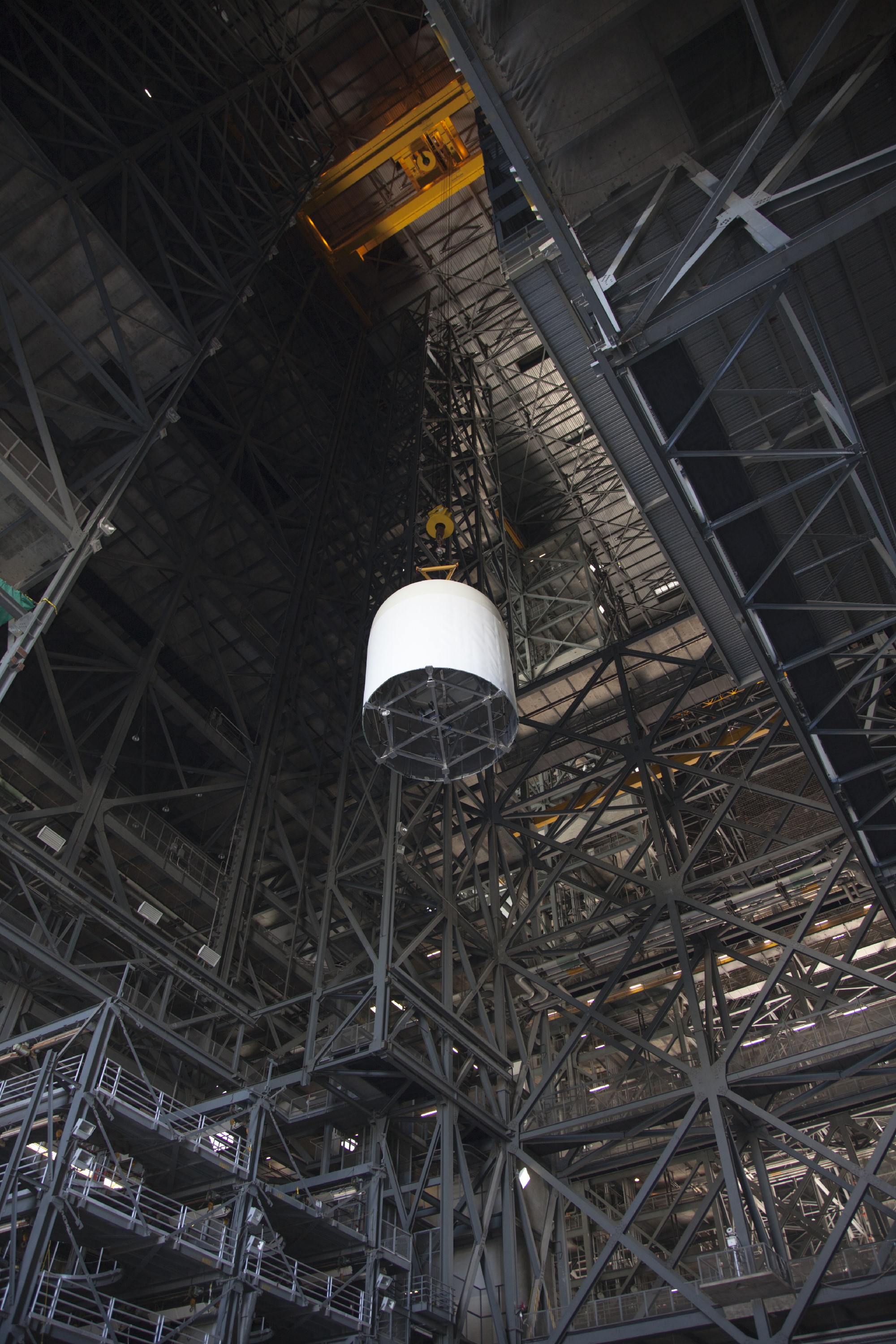 CAPE CANAVERAL, Fla. -- In the transfer aisle of the Vehicle Assembly Building at NASA’s Kennedy Space Center in Florida, a crane operator lifts a full-size mock-up of the Orion spacecraft high in the air for transfer to High Bay 4. Crane operators and technicians practice stacking and de-stacking operations in order to keep processing procedures and skills current for the Ground Systems Development and Operations Program. Orion is the exploration spacecraft designed to carry crews to space beyond low Earth orbit. It will provide emergency abort capability, sustain the crew during the space travel and provide safe re-entry from deep space return velocities. Orion’s first unpiloted test flight is scheduled to launch in 2014 atop a Delta IV rocket. A second uncrewed flight test is scheduled for 2017 on NASA’s Space Launch System rocket. For more information, visit http://www.nasa.gov/orion. Photo credit: NASA/Dan Casper
