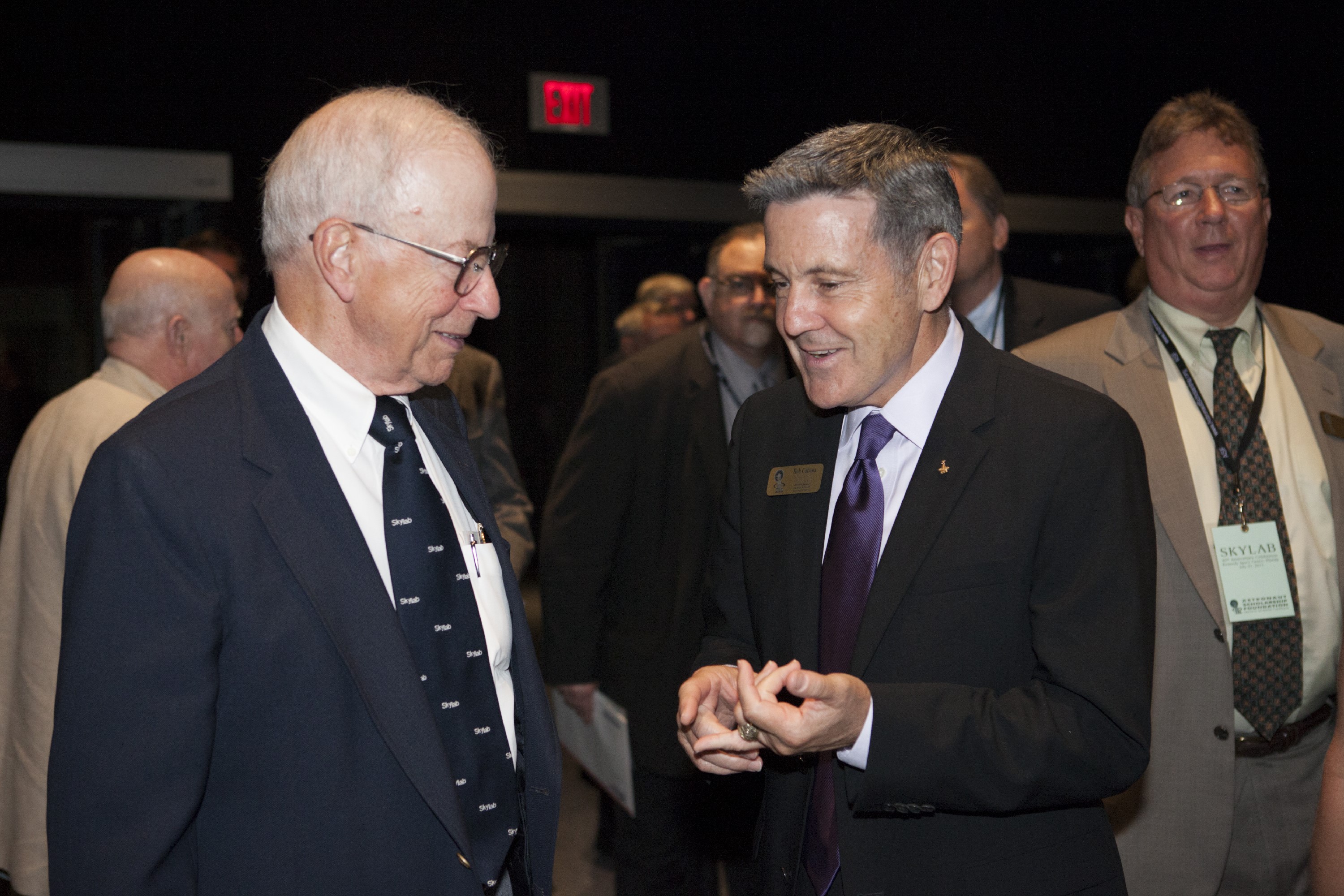 CAPE CANAVERAL, Fla. – At the Kennedy Space Center's Apollo/Saturn V Center Bob Cabana, Kennedy's director, right, speaks with Skylab 2 pilot Paul Weitz during an event sponsored by the Astronaut Scholarship Foundation celebrating the 40th anniversary of Skylab. Both astronauts also flew missions during the Space Shuttle Program. The gala commemorating the 40th anniversary of Skylab included six of the nine astronauts who flew missions to America's first space station. The orbiting laboratory was launched unpiloted from Kennedy on May 14, 1973. Between May 25, 1973 and Feb. 8, 1974, crews of three spent 28, 59 and 84 days living and working in low-Earth orbit aboard the station. For more information, visit http://www.nasa.gov/mission_pages/skylab/ Photo credit: NASA/Kim Shiflett