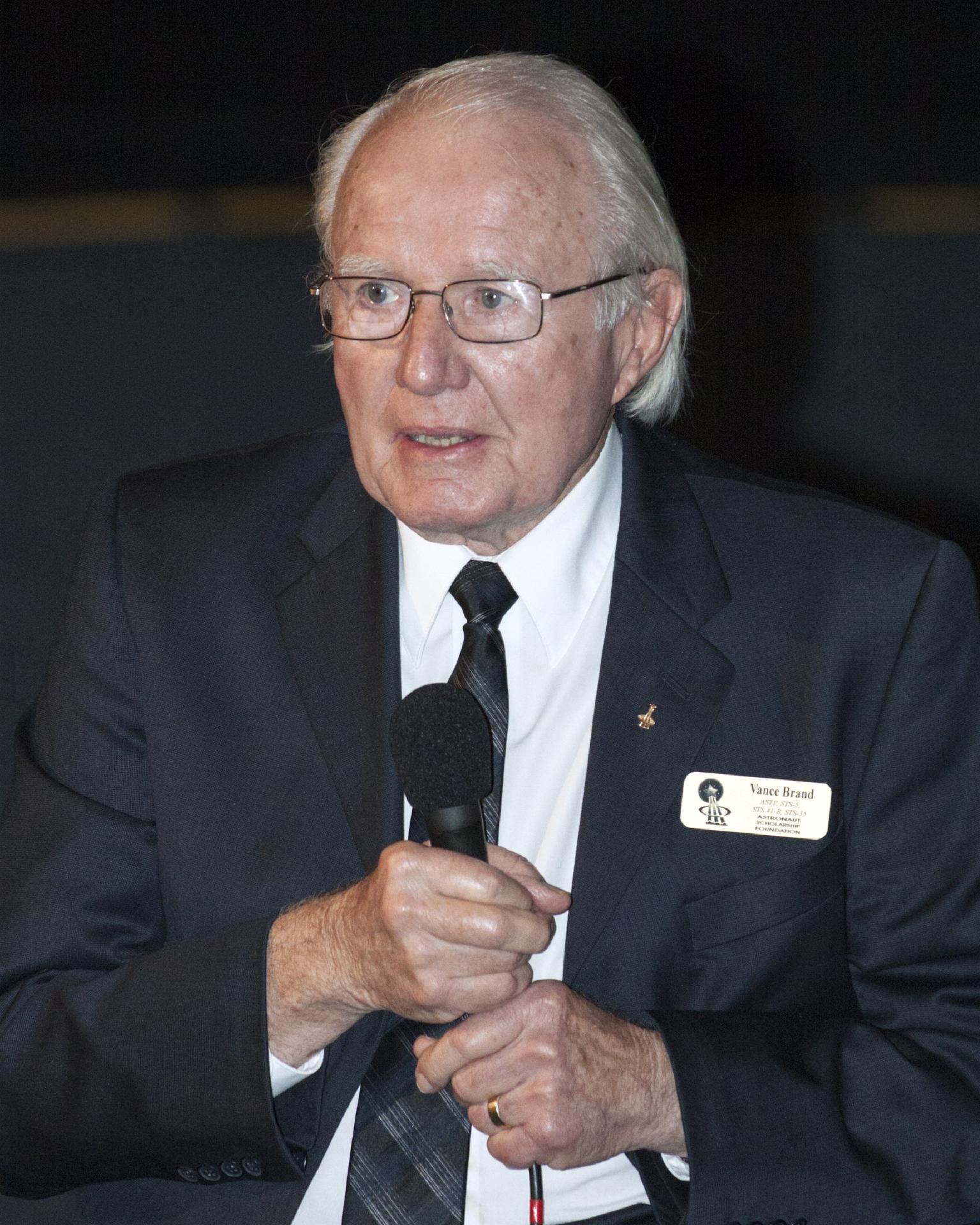 CAPE CANAVERAL, Fla. – At the Kennedy Space Center's Apollo/Saturn V Center, former NASA astronaut Vance Brand speaks to guests at the Astronaut Scholarship Foundation's event celebrating the 40th anniversary of Skylab. Brand, along with astronaut Don Lind, were prepared to fly a mission to rescue a Skylab crew if their Apollo command-service module was unusable. Brand went on to fly as pilot on the Apollo-Soyuz Test Project and missions aboard the space shuttle. The gala commemorating the 40th anniversary of Skylab included six of the nine astronauts who flew missions to America's first space station. The orbiting laboratory was launched unpiloted from Kennedy on May 14, 1973. Between May 25, 1973 and Feb. 8, 1974, crews of three spent 28, 59 and 84 days living and working in low-Earth orbit aboard the station. For more information, visit http://www.nasa.gov/mission_pages/skylab/ Photo credit: NASA/Kim Shiflett