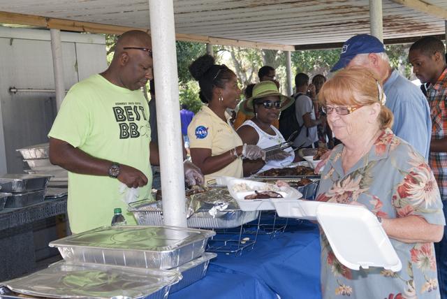 Merritt Island, Fla. – Kennedy Space Center worker James Davis, Maxine Daniels, and Bettye Lee serve delicious food to attendees at the 2013 Black Employee Strategy Team BEST BBQ at KARS I Park on Merritt Island. Events included a noncompetitive car show and a spades tournament. BEST hosts the barbecue as a fundraiser for the Evelyn Johnson Scholarship, which is handed out every year to students who exemplify significant achievement both academically and in their community. The scholarship is in honor of Evelyn Johnson, a founding member of BEST and former deputy director of Kennedy’s Diversity and Equal Opportunity Office. Photo credit: NASA/ Charisse Nahser