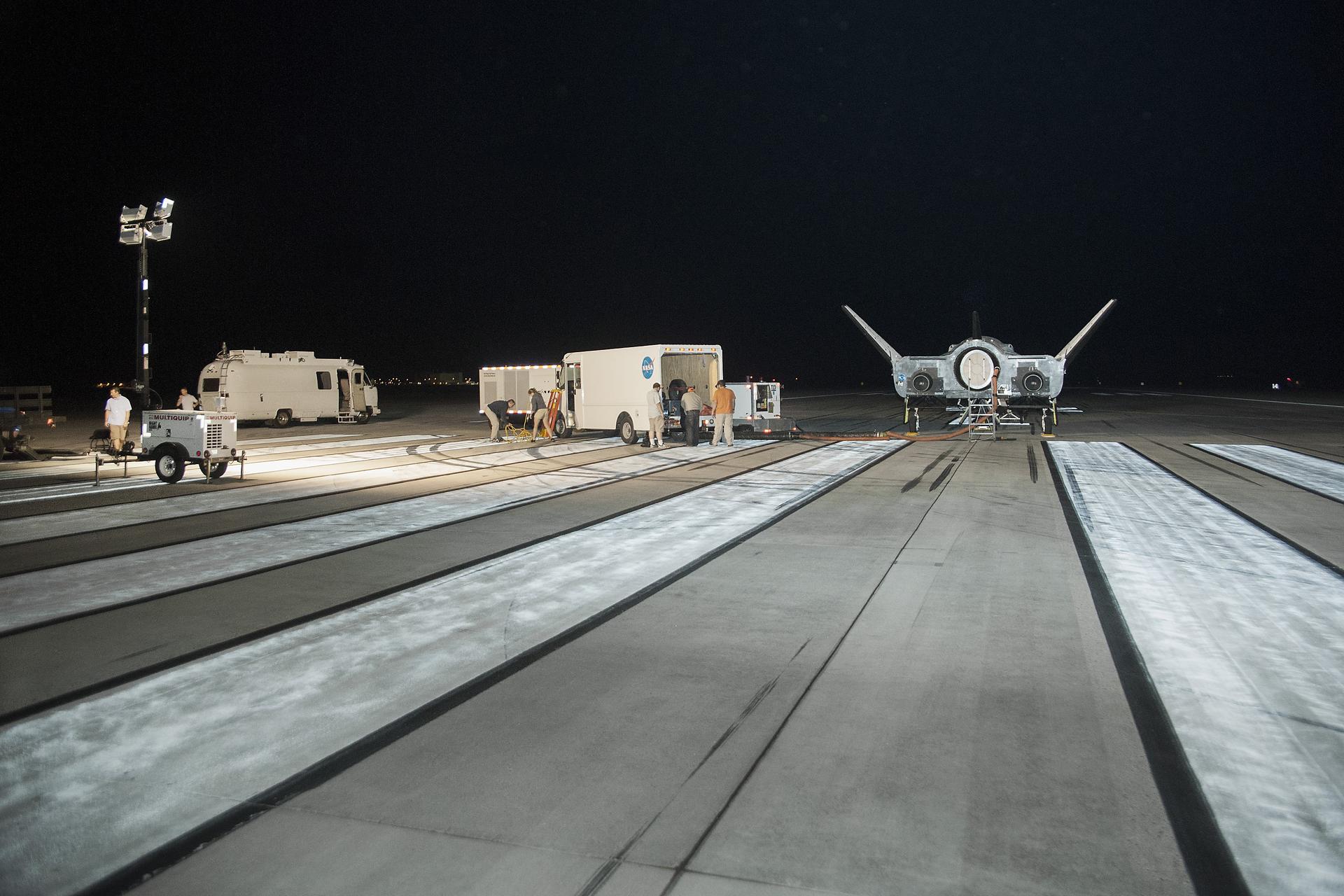 Edwards, Calif. – ED13-0266-010- The Sierra Nevada Corporation, or SNC, Dream Chaser flight vehicle is prepared for 60 mph tow tests on taxi and runways at NASA's Dryden Flight Research Center at Edwards Air Force Base in California. Ground testing at 10, 20, 40 and 60 miles per hour is helping the company validate the performance of the spacecraft's braking and landing systems prior to captive-carry and free-flight tests scheduled for later this year. SNC is continuing the development of its Dream Chaser spacecraft under the agency's Commercial Crew Development Round 2, or CCDev2, and Commercial Crew Integrated Capability, or CCiCap, phases, which are intended to lead to the availability of commercial human spaceflight services for government and commercial customers. To learn more about CCP and its industry partners, visit www.nasa.gov/commercialcrew. Image credit: NASA/Ken Ulbrich