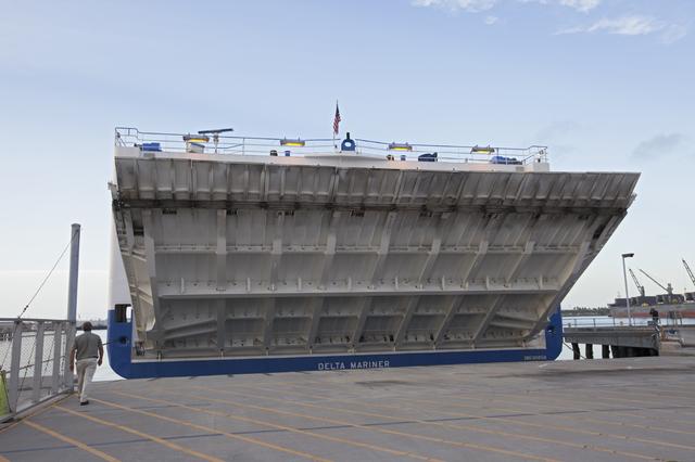 PORT CANAVERAL, Fla. – The United Launch Alliance barge Delta Mariner arrives at Port Canaveral, Fla. delivering the Atlas V launch vehicle that will boost the Mars Atmosphere and Volatile Evolution, or MAVEN, spacecraft to the Red Planet. MAVEN is being prepared for its scheduled launch in November from Cape Canaveral Air Force Station, Fla. atop a United Launch Alliance Atlas V rocket. Positioned in an orbit above the Red Planet, MAVEN will study the upper atmosphere of Mars in unprecedented detail. For more information, visit: http://www.nasa.gov/mission_pages/maven/main/index.html Photo credit: NASA/Kim Shiflett