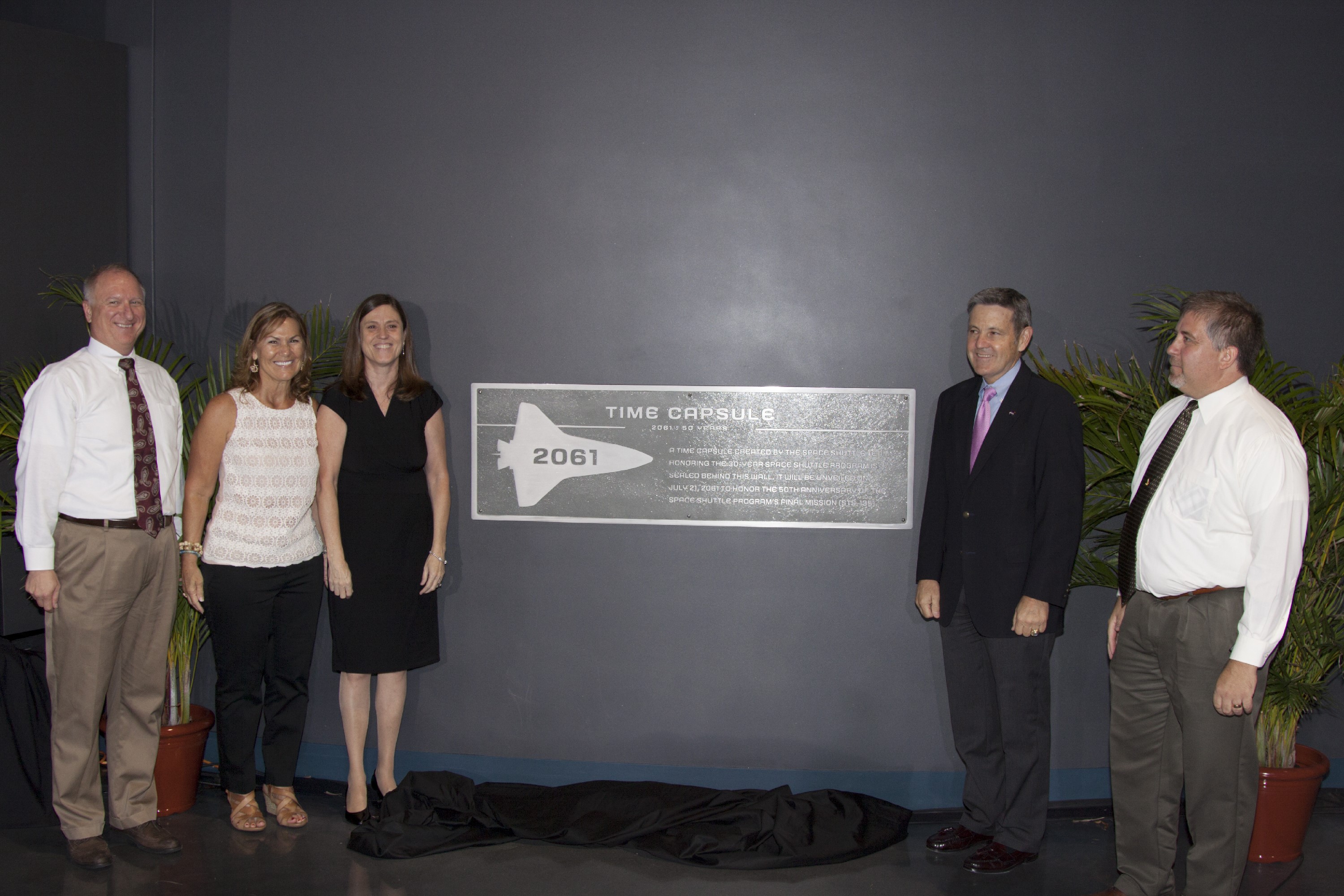 CAPE CANAVERAL, Fla. -- At the Kennedy Space Center Visitor Complex in Florida, officials pose at the site where a Shuttle Program time capsule has been secured vault within the walls of the Space Shuttle Atlantis home at the Kennedy Space Center Visitor Complex. From the left are: Pete Nickolenko, deputy director of NASA Ground Processing at Kennedy, Patty Stratton of Abacus Technology, currently program manager for the Information Management Communications Support Contract. During the Shuttle Program she was deputy director of Ground Operations for NASA's Space Program Operations Contractor, United Space Alliance, Rita Wilcoxon, NASA's now retired director of Shuttle Processing, Bob Cabana, director of the Kennedy Space Center and George Jacobs, deputy director of Center Operations, who was manager of the agency's Shuttle Transition and Retirement Project Office. The time capsule, containing artifacts and other memorabilia associated with the history of the program is designated to be opened on the 50th anniversary of the shuttle's final landing, STS-135. The new $100 million "Space Shuttle Atlantis" facility includes interactive exhibits that tell the story of the 30-year Space Shuttle Program and highlight the future of space exploration. Photo credit: NASA/Jim Grossmann
