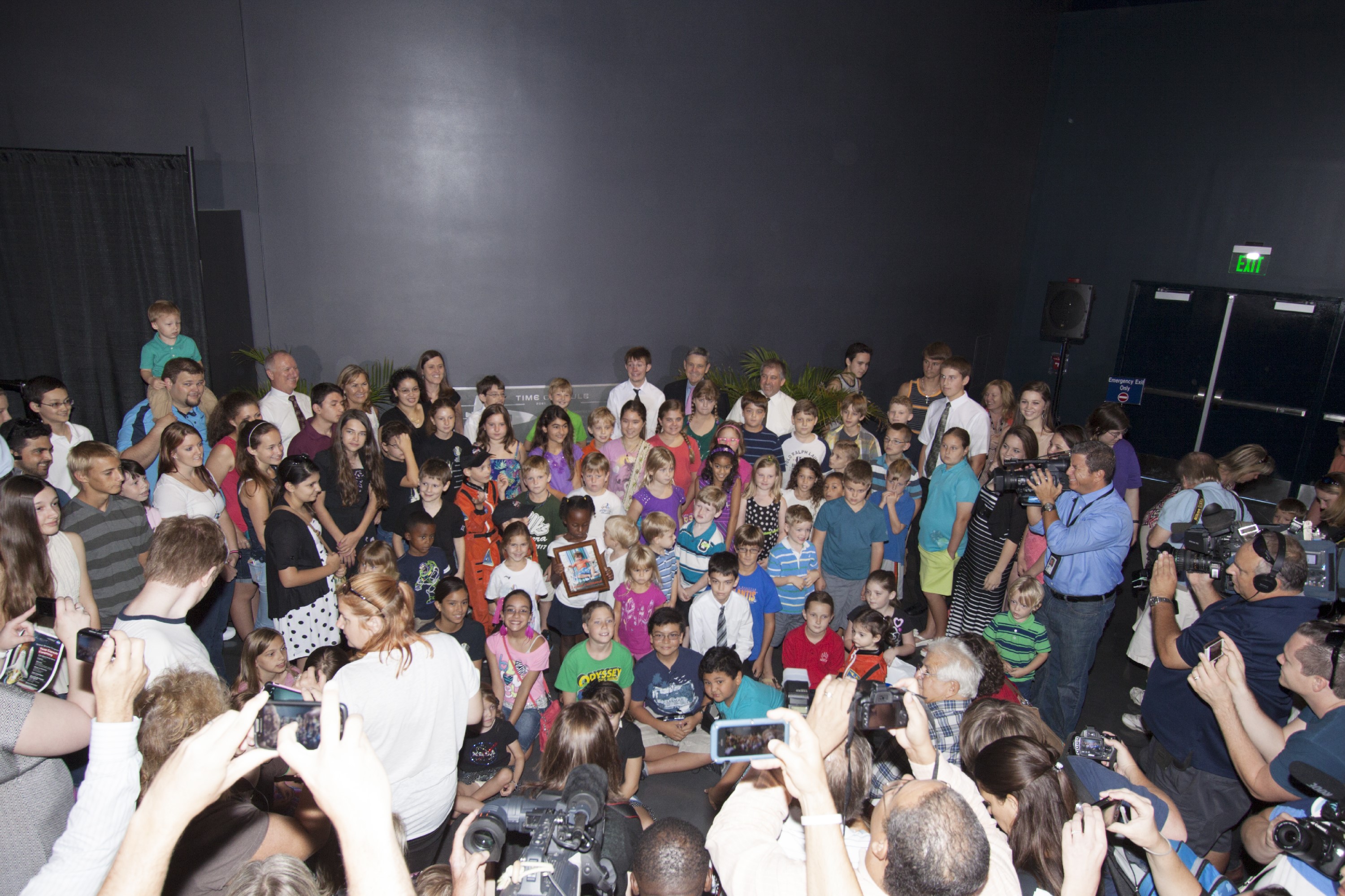 CAPE CANAVERAL, Fla. -- At the Kennedy Space Center Visitor Complex in Florida, future space explorers gather during ceremonies to enshrine a Space Shuttle Program time capsule in a secured vault within the walls of the Space Shuttle Atlantis home at the Kennedy Space Center Visitor Complex. The time capsule, containing artifacts and other memorabilia associated with the history of the program is designated to be opened on the 50th anniversary of the shuttle's final landing, STS-135. The new $100 million "Space Shuttle Atlantis" facility includes interactive exhibits that tell the story of the 30-year Space Shuttle Program and highlight the future of space exploration. Photo credit: NASA/Jim Grossmann