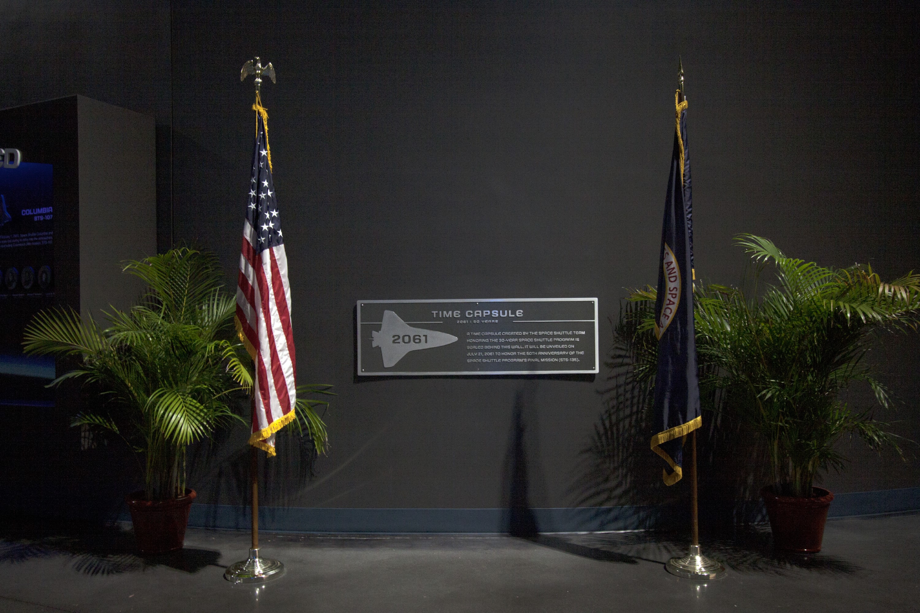 CAPE CANAVERAL, Fla. -- At the Kennedy Space Center Visitor Complex in Florida, a Space Shuttle Program time capsule has been enshrined capsule in a secured vault within the walls of the 90,000-square-foot Space Shuttle Atlantis home. The time capsule, containing artifacts and other memorabilia associated with the history of the program is designated to be opened on the 50th anniversary of the shuttle's final landing, STS-135. The new $100 million "Space Shuttle Atlantis" facility includes interactive exhibits that tell the story of the 30-year Space Shuttle Program and highlight the future of space exploration. Photo credit: NASA/Jim Grossmann