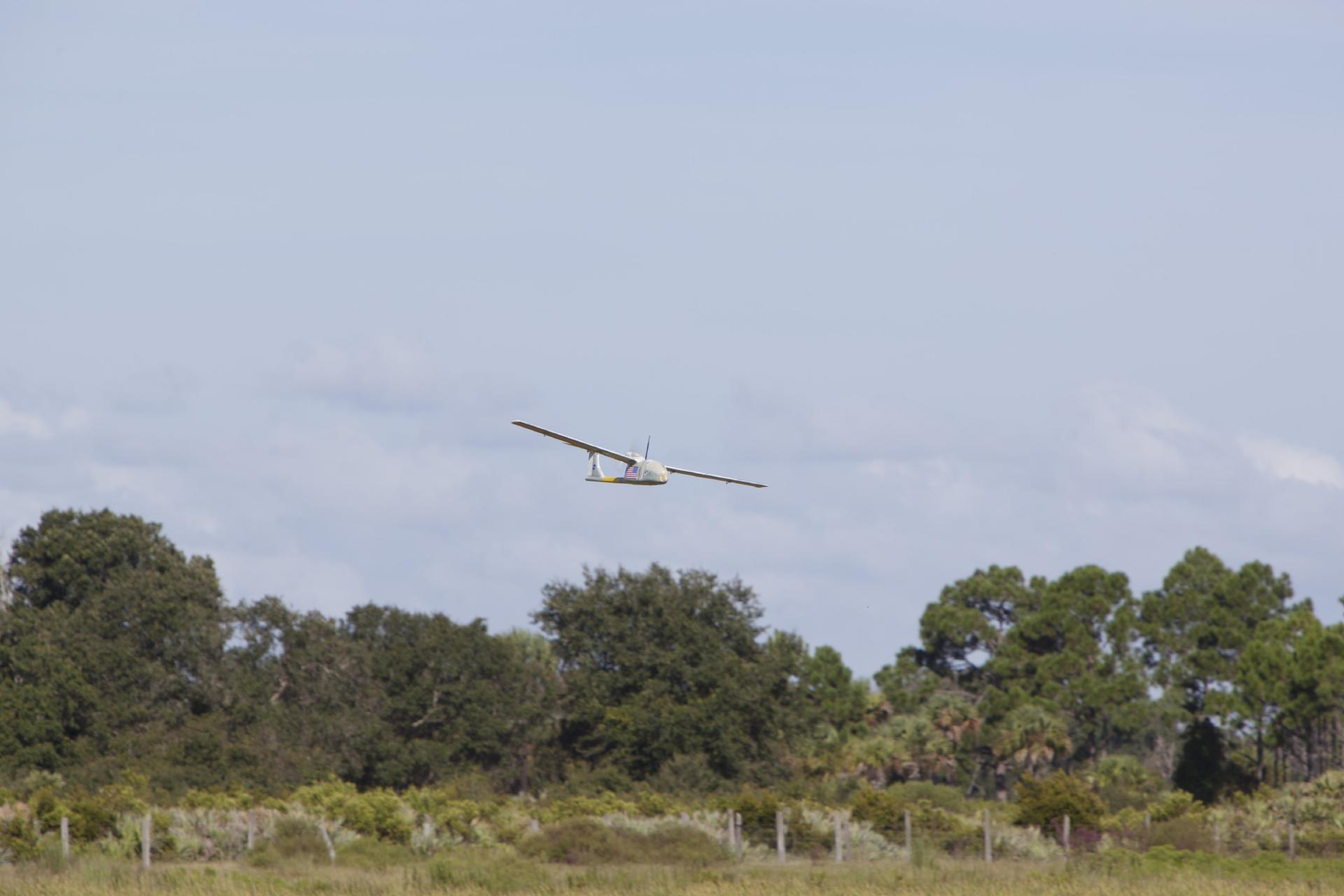 CAPE CANAVERAL, Fla. – A remote-controlled aircraft flies during a competition with a unique set of sensors and software to conduct a mock search-and-rescue operation. The aircraft was assembled by a team of engineers from NASA's Kennedy Space Center. Teams from Johnson Space Center, Kennedy and Marshall Space Flight Center competed in the unmanned aerial systems event to evaluate designs and work by engineers learning new specialties. The competition took place at the Shuttle Landing Facility at Kennedy. Photo credit: NASA/Dmitri Gerondidakis