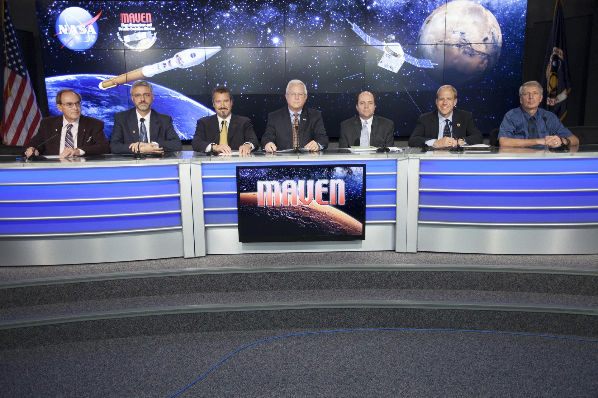 CAPE CANAVERAL, Fla. – During a news conference at NASA's Kennedy Space Center in Florida, agency and contractor officials discussed preparations for the launch of the Mars Atmosphere and Volatile EvolutioN, or MAVEN, mission. Participating in the briefing, from the left, are George Diller of NASA Public Affairs, Geoffrey Yoder, NASA deputy associate administrator of programs in the Science Mission Directorate, Omar Baez, NASA launch director, Vernon Thorp, program manager for NASA Missions with United Launch Alliance in Centennial, Colo., David Mitchell, NASA's MAVEN project manager at the Goddard Space Flight Center in Greenbelt, Md., Guy Beutelschies, Lockheed Martin's MAVEN project manager and Clay Flinn, launch weather officer, 45th Weather Squadron at Cape Canaveral Air Force Station, Fla. MAVEN is being prepared for its scheduled launch on Nov 18, 2013 from Cape Canaveral Air Force Station, Fla. atop a United Launch Alliance Atlas V rocket. Positioned in an orbit above the Red Planet, MAVEN will study the upper atmosphere of Mars in unprecedented detail. For information on the MAVEN mission, visit: http://www.nasa.gov/mission_pages/maven/main/index.html. Photo credit: NASA MAVEN is being prepared for its scheduled launch on Nov 18, 2013 from Cape Canaveral Air Force Station, Fla. atop a United Launch Alliance Atlas V rocket. Positioned in an orbit above the Red Planet, MAVEN will study the upper atmosphere of Mars in unprecedented detail. For more information, visit: http://www.nasa.gov/mission_pages/maven/main/index.html Photo credit: NASA/Kim Shiflett