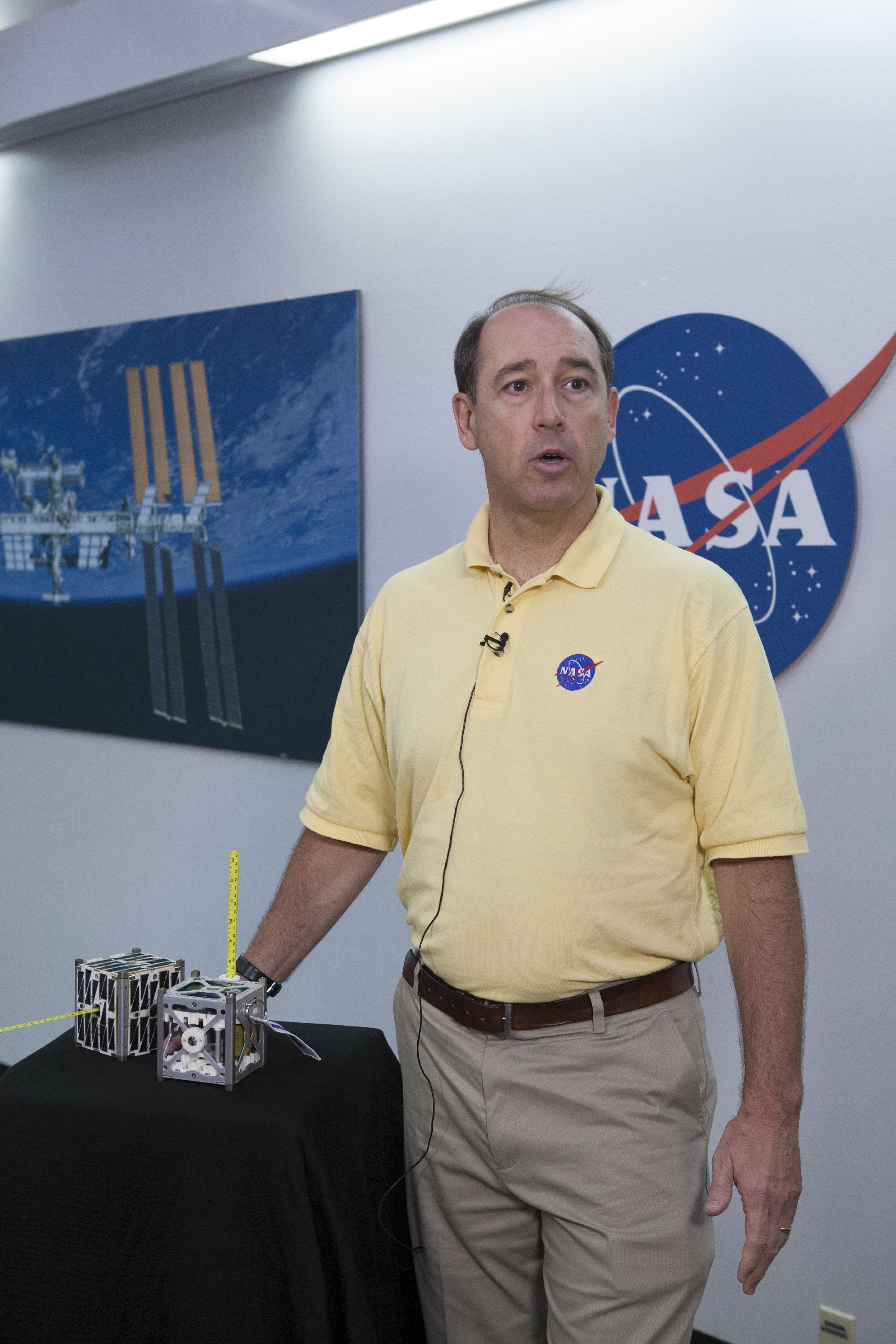 CAPE CANAVERAL, Fla. -- At the News Center at NASA's Kennedy Space Center in Florida, Andrew Petro, the agency's acting director of the Early Stage Innovation Division of the Office of the Chief Technologist, discusses the agency’s CubeSat Launch initiative. CubeSats provide opportunities for small satellite payloads to fly on rockets planned for upcoming launches. CubeSats, a class of research spacecraft called nanosatellites, are flown as auxiliary payloads on previously planned missions. The cube-shaped satellites are approximately four inches long, have a volume of about one quart and weigh about three pounds. For more information, visit: http://www.nasa.gov/directorates/heo/home/CubeSats_initiative.html Photo credit: NASA/Kim Shiflett