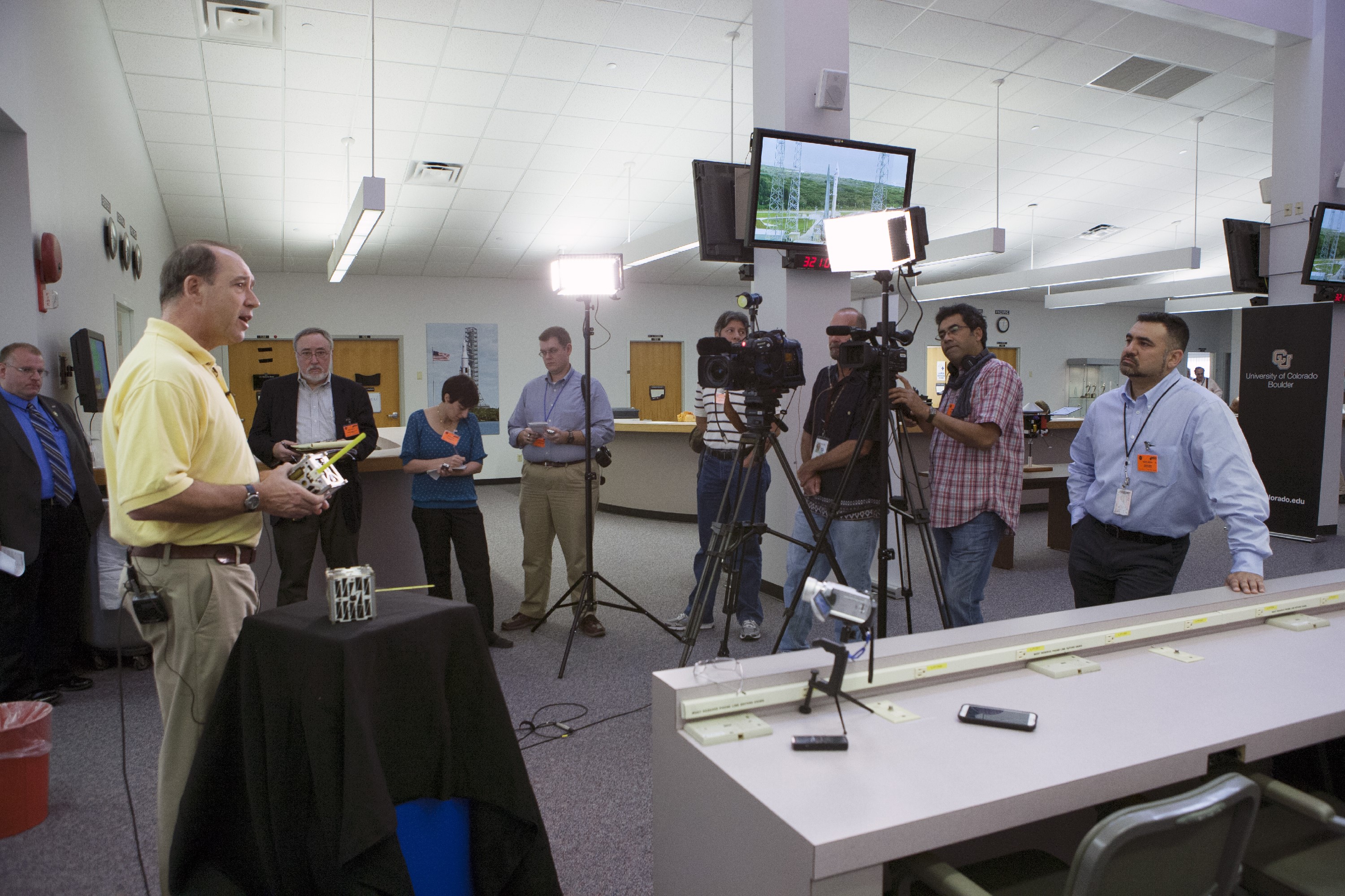 CAPE CANAVERAL, Fla. -- At the News Center at NASA's Kennedy Space Center in Florida, Andrew Petro, the agency's acting director of the Early Stage Innovation Division of the Office of the Chief Technologist, discusses the agency’s CubeSat Launch initiative. CubeSats provide opportunities for small satellite payloads to fly on rockets planned for upcoming launches. CubeSats, a class of research spacecraft called nanosatellites, are flown as auxiliary payloads on previously planned missions. The cube-shaped satellites are approximately four inches long, have a volume of about one quart and weigh about three pounds. For more information, visit: http://www.nasa.gov/directorates/heo/home/CubeSats_initiative.html Photo credit: NASA/Kim Shiflett