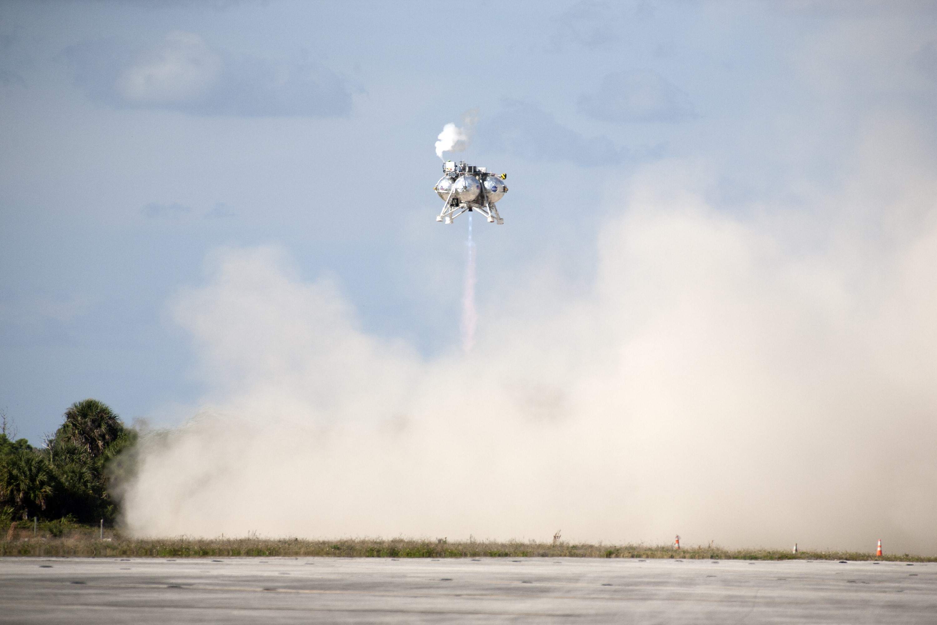 CAPE CANAVERAL, Fla. – The first free flight of the Project Morpheus prototype lander was conducted at the Shuttle Landing Facility at NASA’s Kennedy Space Center in Florida. Smoke fills the air as the engine fires and the Morpheus lander launched from the ground over a flame trench. During the 54-second test, it ascended approximately 50 feet, and hovered for about 15 seconds. The lander then flew forward and landed on its pad about 23 feet from the launch point. Testing of the prototype lander was performed at NASA’s Johnson Space Center in Houston in preparation for tethered and free flight testing at Kennedy. Project Morpheus integrates NASA’s automated landing and hazard avoidance technology, or ALHAT, with an engine that runs on liquid oxygen and methane, or green propellants, into a fully-operational lander that could deliver cargo to asteroids and other planetary surfaces. The landing facility will provide the lander with the kind of field necessary for realistic testing, complete with rocks, craters and hazards to avoid. Morpheus’ ALHAT payload allows it to navigate to clear landing sites amidst rocks, craters and other hazards during its descent. Project Morpheus is being managed under the Advanced Exploration Systems, or AES, Division in NASA’s Human Exploration and Operations Mission Directorate. The efforts in AES pioneer new approaches for rapidly developing prototype systems, demonstrating key capabilities and validating operational concepts for future human missions beyond Earth orbit. For more information on Project Morpheus, visit http://morpheuslander.jsc.nasa.gov. Photo credit: NASA/Kim Shiflett