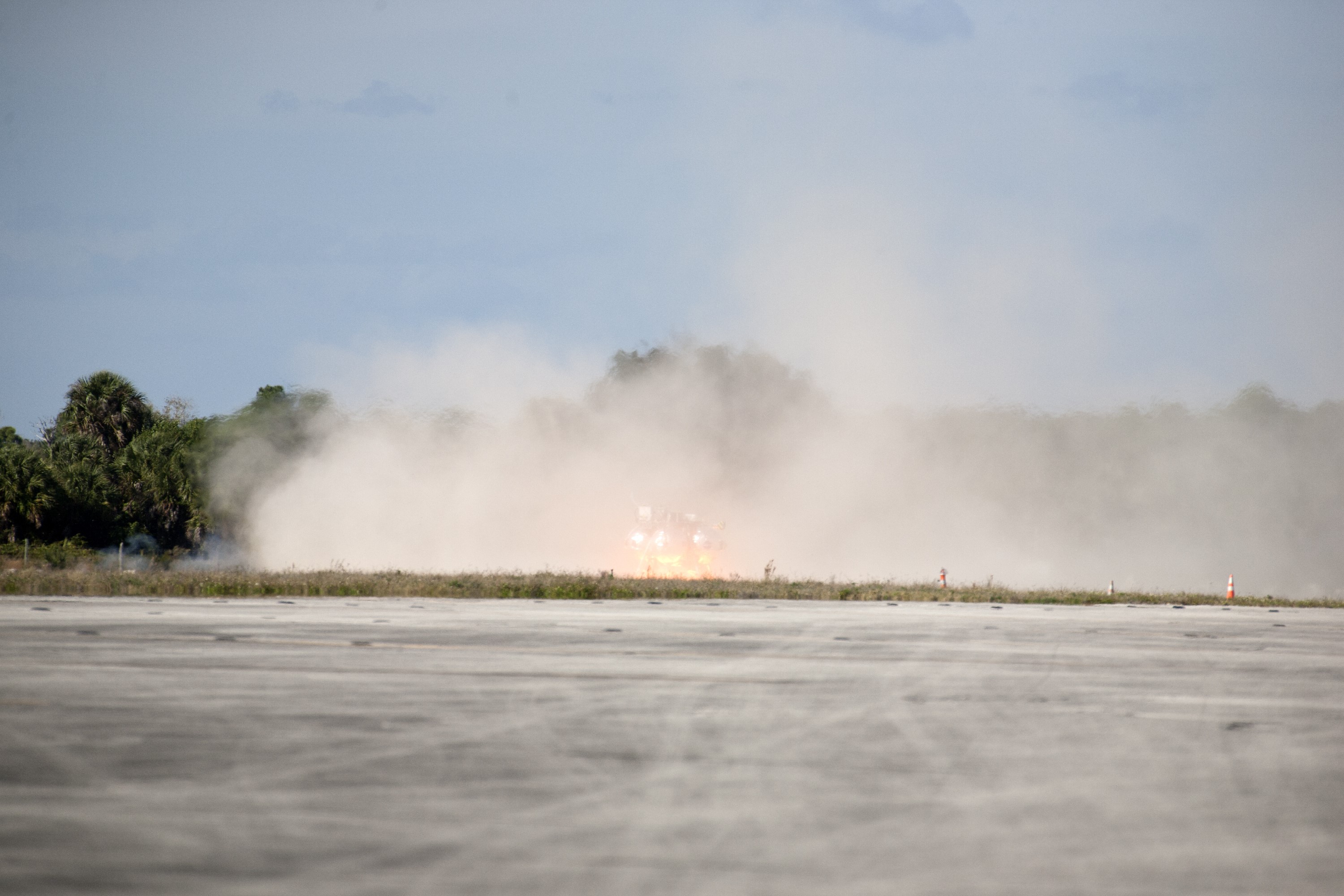 CAPE CANAVERAL, Fla. – The first free flight of the Project Morpheus prototype lander was conducted at the Shuttle Landing Facility at NASA’s Kennedy Space Center in Florida. Smoke filled the air as the engine fired and the Morpheus lander launched from the ground over a flame trench. During the 54-second test, it ascended approximately 50 feet, and hovered for about 15 seconds. The lander then flew forward and landed on its pad about 23 feet from the launch point. Testing of the prototype lander was performed at NASA’s Johnson Space Center in Houston in preparation for tethered and free flight testing at Kennedy. Project Morpheus integrates NASA’s automated landing and hazard avoidance technology, or ALHAT, with an engine that runs on liquid oxygen and methane, or green propellants, into a fully-operational lander that could deliver cargo to asteroids and other planetary surfaces. The landing facility will provide the lander with the kind of field necessary for realistic testing, complete with rocks, craters and hazards to avoid. Morpheus’ ALHAT payload allows it to navigate to clear landing sites amidst rocks, craters and other hazards during its descent. Project Morpheus is being managed under the Advanced Exploration Systems, or AES, Division in NASA’s Human Exploration and Operations Mission Directorate. The efforts in AES pioneer new approaches for rapidly developing prototype systems, demonstrating key capabilities and validating operational concepts for future human missions beyond Earth orbit. For more information on Project Morpheus, visit http://morpheuslander.jsc.nasa.gov. Photo credit: NASA/Kim Shiflett