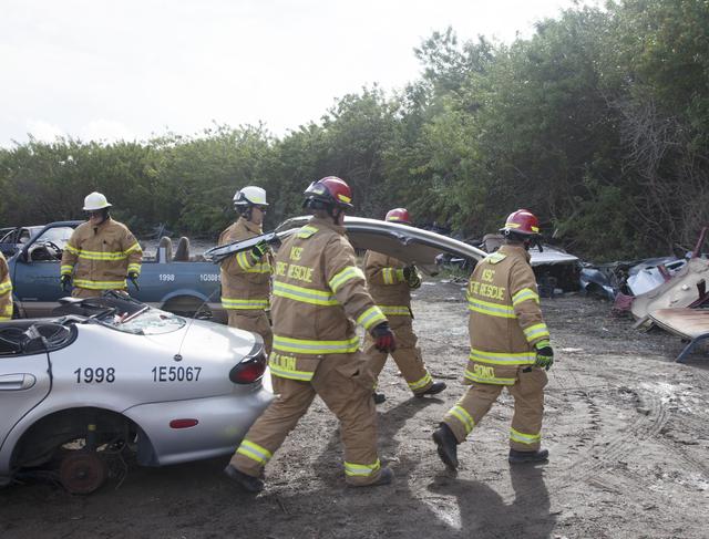 CAPE CANAVERAL, Fla. – Special Rescue Operations firefighters with NASA Fire Rescue Services in the Protective Services Office at NASA’s Kennedy Space Center in Florida practice vehicle extrication training at an auto salvage yard near the center. Firefighters carry away the roof of the car that was removed using a special hydraulic cutting tool and reciprocating saw. Other firefighters used axes and special tools to punch through and clear away the windshield and windows. They will use the Jaws of Life to simulate the rescue of a trapped and injured person. Kennedy’s firefighters recently achieved Pro Board Certification in aerial fire truck operations. With the completion of vehicle extrication and Jaws of Life training, the Protective Services Office is one step closer to achieving certification in vehicle machinery extrication. Kennedy’s firefighters are with G4S Government Solutions Inc., on the Kennedy Protective Services Contract. Photo credit: NASA/Daniel Casper