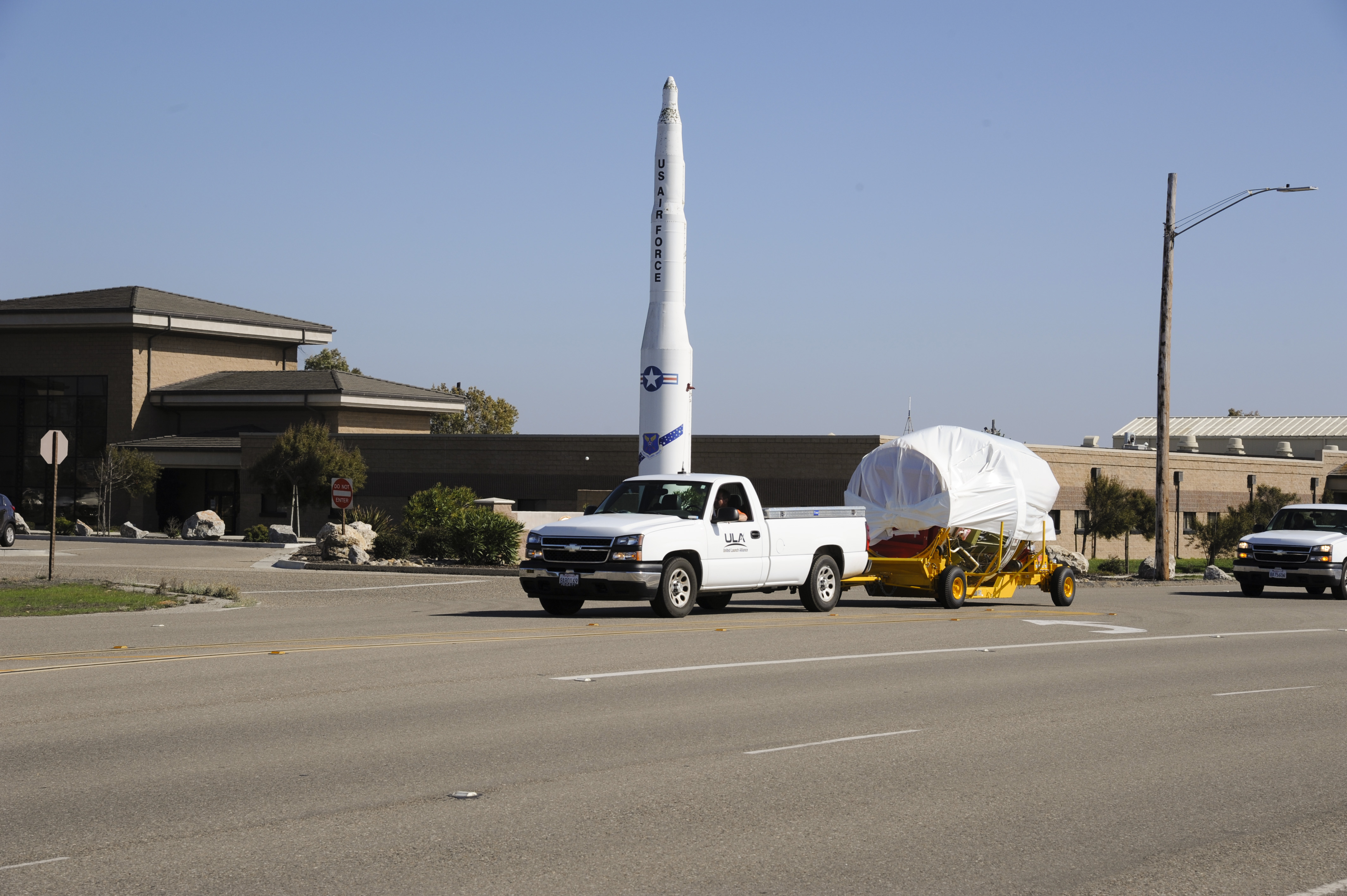 VANDENBERG AIR FORCE BASE, Calif. – The second stage for NASA's Orbiting Carbon Observatory-2 mission, or OCO-2, passes a static display of a U.S. Air Force Minuteman III intercontinental ballistic missile on its move from the Building 836 hangar to the Horizontal Processing Facility at Space Launch Complex 2 on Vandenberg Air Force Base in California. OCO-2 is scheduled to launch aboard a United Launch Alliance Delta II rocket in July. The rocket's second stage will insert OCO-2 into a polar Earth orbit. OCO-2 will collect precise global measurements of carbon dioxide in the Earth's atmosphere and provide scientists with a better idea of the chemical compound's impacts on climate change. Scientists will analyze this data to improve our understanding of the natural processes and human activities that regulate the abundance and distribution of this important atmospheric gas. To learn more about OCO-2, visit http://oco.jpl.nasa.gov. Photo credit: NASA/Arron Tauman, 30th Space Wing, VAFB