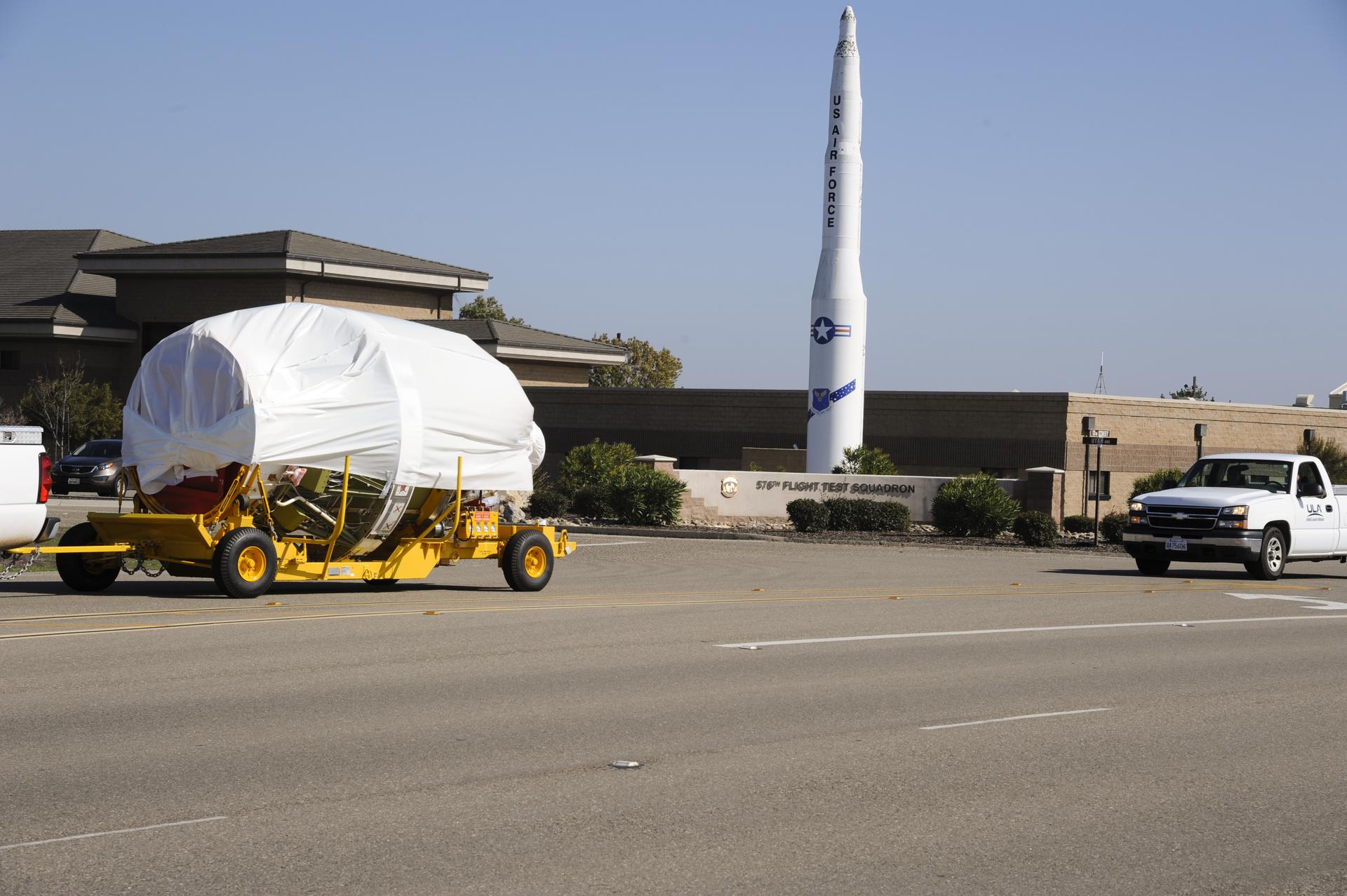 VANDENBERG AIR FORCE BASE, Calif. – The second stage for NASA's Orbiting Carbon Observatory-2 mission, or OCO-2, passes a static display of a U.S. Air Force Minuteman III intercontinental ballistic missile on its move from the Building 836 hangar to the Horizontal Processing Facility at Space Launch Complex 2 on Vandenberg Air Force Base in California. OCO-2 is scheduled to launch aboard a United Launch Alliance Delta II rocket in July. The rocket's second stage will insert OCO-2 into a polar Earth orbit. OCO-2 will collect precise global measurements of carbon dioxide in the Earth's atmosphere and provide scientists with a better idea of the chemical compound's impacts on climate change. Scientists will analyze this data to improve our understanding of the natural processes and human activities that regulate the abundance and distribution of this important atmospheric gas. To learn more about OCO-2, visit http://oco.jpl.nasa.gov. Photo credit: NASA/Arron Tauman, 30th Space Wing, VAFB
