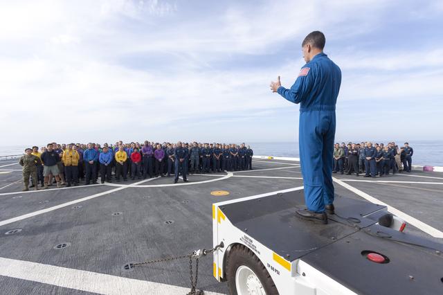SAN DIEGO, Calif. – On the top deck of the USS San Diego, NASA and U.S. Navy personnel gather after the Orion underway recovery test. The Orion boilerplate test vehicle and other hardware were transported about 100 miles offshore for the recovery test. NASA and the U.S. Navy conducted tests to prepare for recovery of the Orion crew module, forward bay cover and parachutes on its return from a deep space mission. The underway recovery test will allow the teams to demonstrate and evaluate the recovery processes, procedures, hardware and personnel in open waters. During the testing, the tether lines were unable to support the tension caused by crew module motion that was driven by wave turbulence in the well deck of the ship. NASA and the U.S. Navy are reviewing the testing data collected to evaluate the next steps. The Ground Systems Development and Operations Program conducted the underway recovery tests. Orion is the exploration spacecraft designed to carry astronauts to destinations not yet explored by humans, including an asteroid and Mars. It will have emergency abort capability, sustain the crew during space travel and provide safe re-entry from deep space return velocities. The first unpiloted test flight of the Orion is scheduled to launch in 2014 atop a Delta IV rocket and in 2017 on NASA’s Space Launch System rocket. For more information, visit http://www.nasa.gov/orion. Photo credit: NASA/Cory Huston