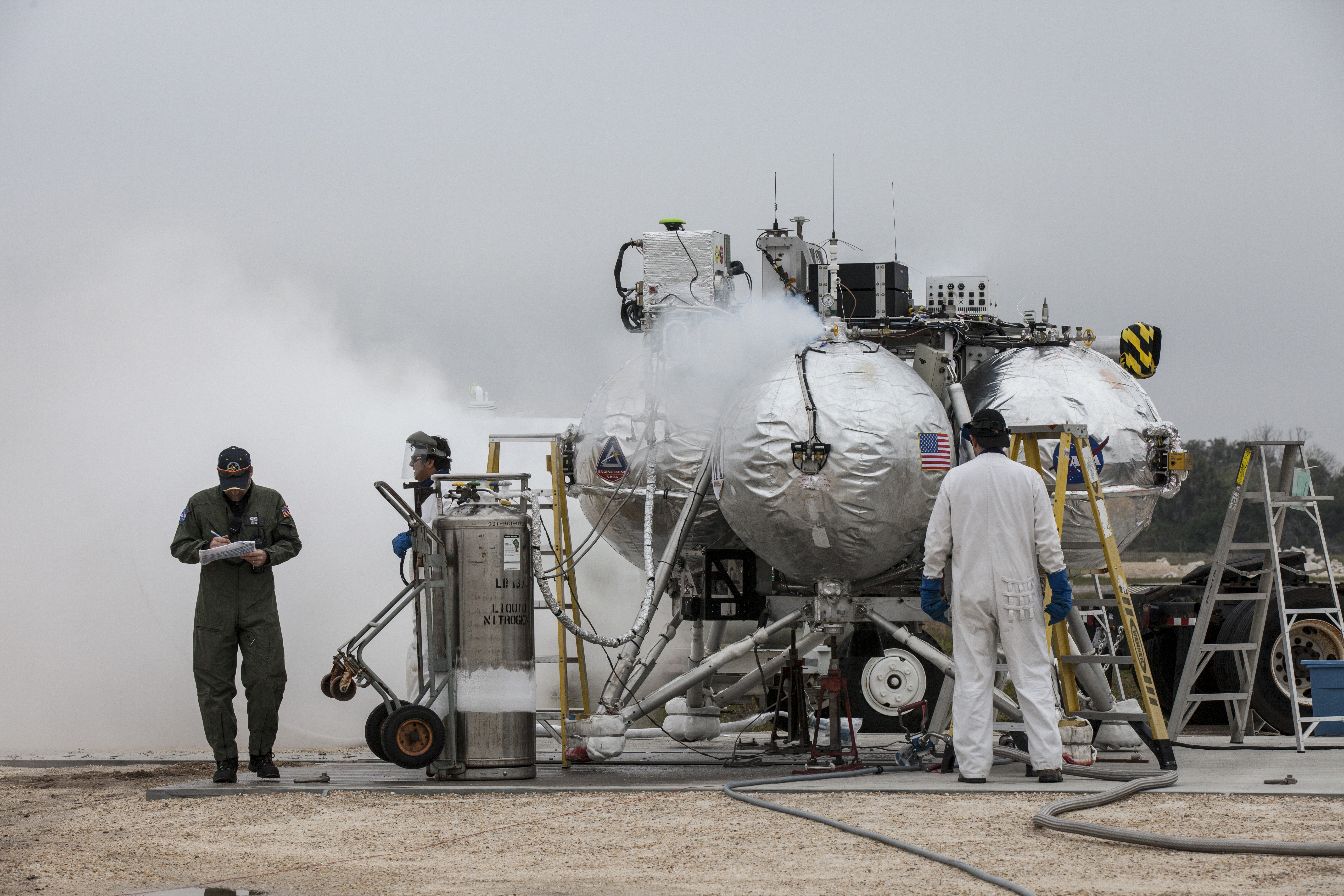 CAPE CANAVERAL, Fla. – Engineers and technicians prepare the Project Morpheus prototype lander for its sixth free flight test from a launch pad at the north end of the Shuttle Landing Facility at NASA’s Kennedy Space Center in Florida. The 82-second test began at 11:32 a.m. EST with the Morpheus lander launching from the ground over a flame trench and ascending to 465 feet. The lander flew forward, covering 633 feet while performing a 55-foot divert to emulate a hazard avoidance maneuver before descending and landing on a dedicated pad inside the automated landing and hazard avoidance technology, or ALHAT, hazard field. Morpheus landed 10 inches west of its intended target. Project Morpheus tests NASA’s ALHAT and an engine that runs on liquid oxygen and methane, or green propellants, into a fully-operational lander that could deliver cargo to other planetary surfaces. The landing facility provides the lander with the kind of field necessary for realistic testing, complete with rocks, craters and hazards to avoid. Morpheus’ ALHAT payload allows it to navigate to clear landing sites amidst rocks, craters and other hazards during its descent. Project Morpheus is being managed under the Advanced Exploration Systems, or AES, Division in NASA’s Human Exploration and Operations Mission Directorate. The efforts in AES pioneer new approaches for rapidly developing prototype systems, demonstrating key capabilities and validating operational concepts for future human missions beyond Earth orbit. For more information on Project Morpheus, visit http://morpheuslander.jsc.nasa.gov/. Photo credit: NASA/Kim Shiflett