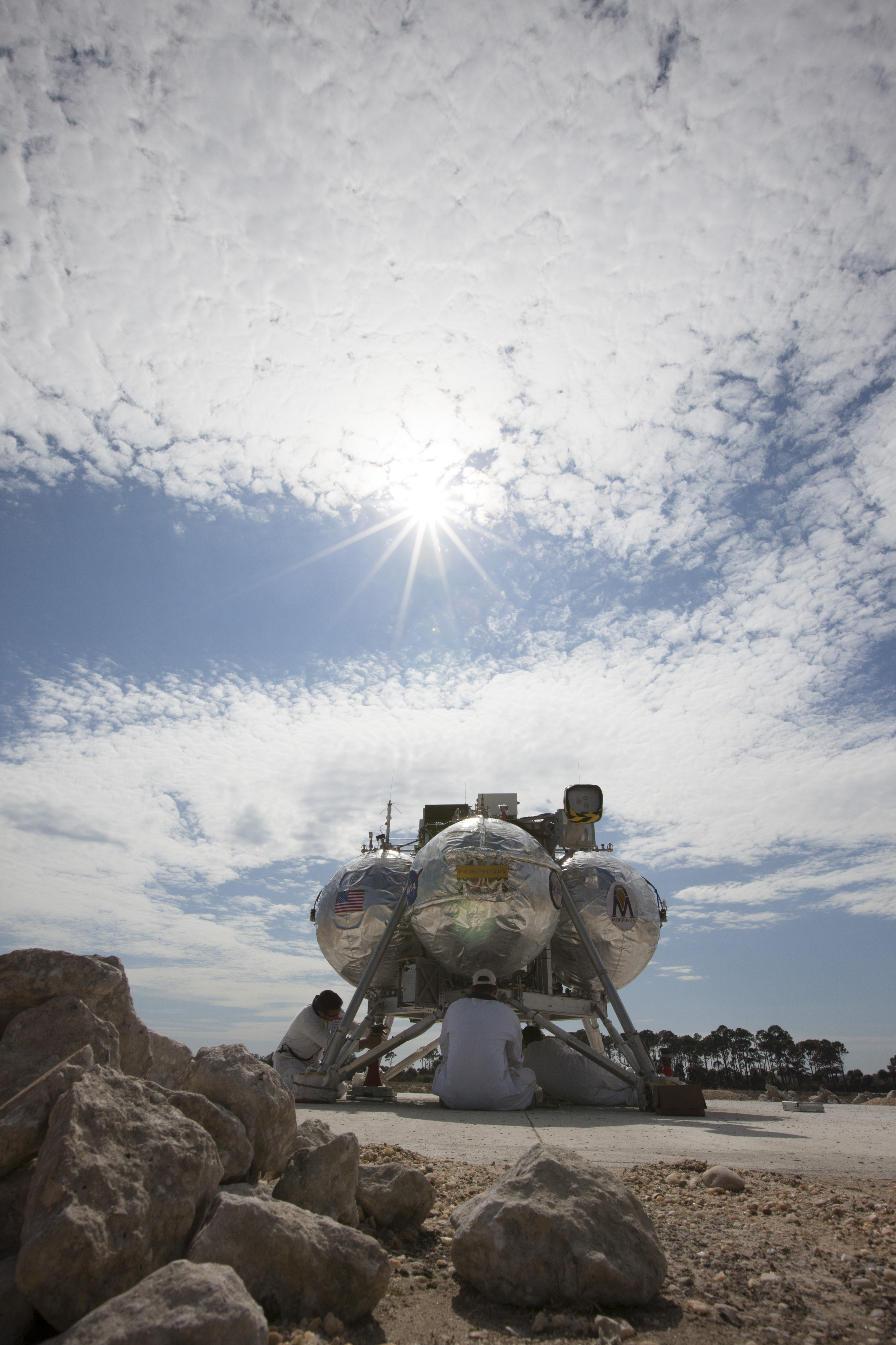 CAPE CANAVERAL, Fla. - Technicians prepare the Project Morpheus prototype lander for its seventh free flight test at the north end of the Shuttle Landing Facility at NASA’s Kennedy Space Center in Florida. The 83-second test began at 3:41 p.m. EDT with the Morpheus lander launching from the ground over a flame trench and ascending to 580 feet, its highest to date. Morpheus then flew its fastest downrange trek at 30 mph, travelling farther than before, 837 feet. The lander performed a 42-foot divert to emulate a hazard avoidance maneuver before descending and touching down on Landing Site 2, at the northern landing pad inside the automated landing and hazard avoidance technology ALHAT hazard field. Morpheus landed within one foot of its intended target. Project Morpheus tests NASA’s ALHAT and an engine that runs on liquid oxygen and methane, or green propellants, into a fully-operational lander that could deliver cargo to other planetary surfaces. The landing facility provides the lander with the kind of field necessary for realistic testing, complete with rocks, craters and hazards to avoid. Morpheus’ ALHAT payload allows it to navigate to clear landing sites amidst rocks, craters and other hazards during its descent. Project Morpheus is being managed under the Advanced Exploration Systems, or AES, Division in NASA’s Human Exploration and Operations Mission Directorate. The efforts in AES pioneer new approaches for rapidly developing prototype systems, demonstrating key capabilities and validating operational concepts for future human missions beyond Earth orbit. For more information on Project Morpheus, visit http://morpheuslander.jsc.nasa.gov/. Photo credit: NASA/Kim Shiflett