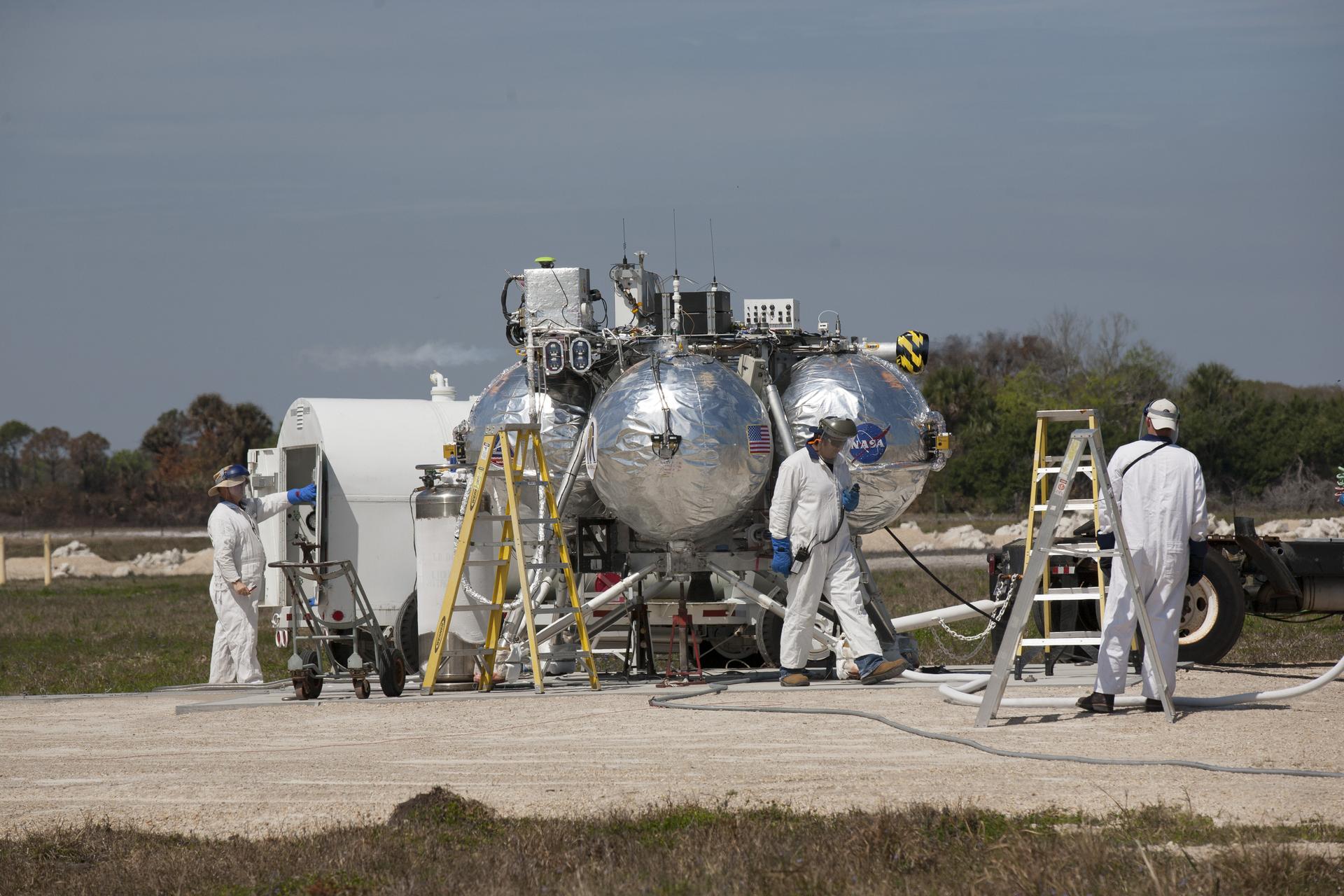 CAPE CANAVERAL, Fla. - Engineers and technicians prepare the Project Morpheus prototype lander for its seventh free flight test at the north end of the Shuttle Landing Facility at NASA’s Kennedy Space Center in Florida. The 83-second test began at 3:41 p.m. EDT with the Morpheus lander launching from the ground over a flame trench and ascending to 580 feet, its highest to date. Morpheus then flew its fastest downrange trek at 30 mph, travelling farther than before, 837 feet. The lander performed a 42-foot divert to emulate a hazard avoidance maneuver before descending and touching down on Landing Site 2, at the northern landing pad inside the automated landing and hazard avoidance technology ALHAT hazard field. Morpheus landed within one foot of its intended target. Project Morpheus tests NASA’s ALHAT and an engine that runs on liquid oxygen and methane, or green propellants, into a fully-operational lander that could deliver cargo to other planetary surfaces. The landing facility provides the lander with the kind of field necessary for realistic testing, complete with rocks, craters and hazards to avoid. Morpheus’ ALHAT payload allows it to navigate to clear landing sites amidst rocks, craters and other hazards during its descent. Project Morpheus is being managed under the Advanced Exploration Systems, or AES, Division in NASA’s Human Exploration and Operations Mission Directorate. The efforts in AES pioneer new approaches for rapidly developing prototype systems, demonstrating key capabilities and validating operational concepts for future human missions beyond Earth orbit. For more information on Project Morpheus, visit http://morpheuslander.jsc.nasa.gov/. Photo credit: NASA/Kim Shiflett