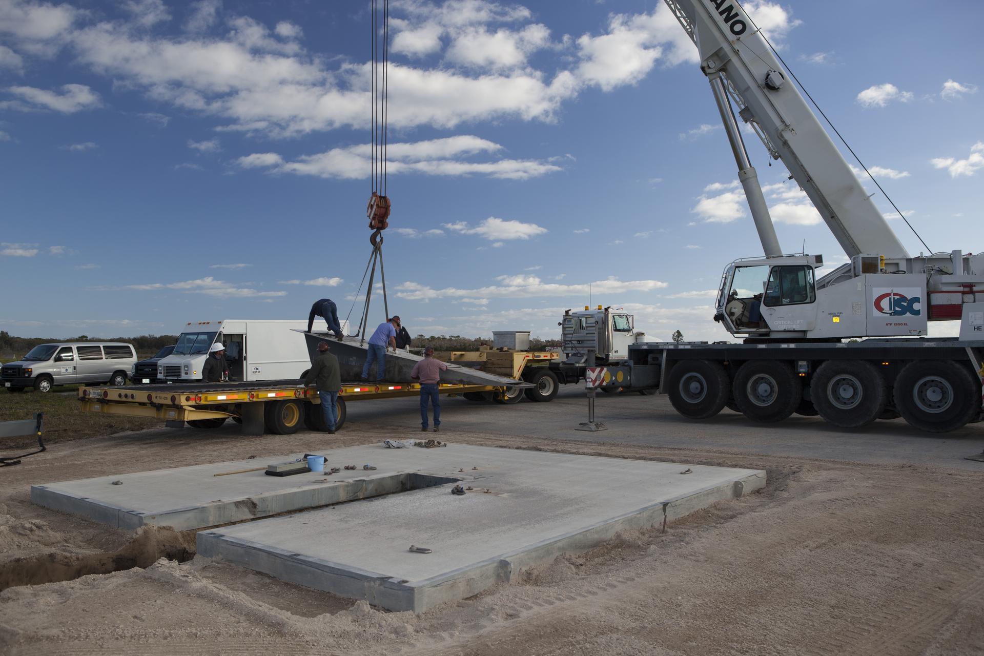 CAPE CANAVERAL, Fla. – Construction workers assist as a crane lowers a portion of the launch pad for the Project Morpheus prototype lander onto a transporter at the north end of the Shuttle Landing Facility at NASA’s Kennedy Space Center in Florida. The launch pad is being moved to a different location at the landing facility to support the next phase of flight testing. Morpheus completed its seventh free flight test on March 11. The 83-second test began at 3:41 p.m. EDT with the Morpheus lander launching from the ground over a flame trench and ascending to 580 feet. Morpheus then flew its fastest downrange trek at 30 mph, travelling farther than before, 837 feet. The lander performed a 42-foot divert to emulate a hazard avoidance maneuver before descending and touching down on Landing Site 2, at the northern landing pad inside the automated landing and hazard avoidance technology ALHAT hazard field. Morpheus landed within one foot of its intended target. Project Morpheus tests NASA’s ALHAT and an engine that runs on liquid oxygen and methane, or green propellants, into a fully-operational lander that could deliver cargo to other planetary surfaces. The landing facility provides the lander with the kind of field necessary for realistic testing, complete with rocks, craters and hazards to avoid. Morpheus’ ALHAT payload allows it to navigate to clear landing sites amidst rocks, craters and other hazards during its descent. Project Morpheus is being managed under the Advanced Exploration Systems, or AES, Division in NASA’s Human Exploration and Operations Mission Directorate. The efforts in AES pioneer new approaches for rapidly developing prototype systems, demonstrating key capabilities and validating operational concepts for future human missions beyond Earth orbit. For more information on Project Morpheus, visit http://morpheuslander.jsc.nasa.gov/. Photo credit: NASA/Dimitri Gerondidakis