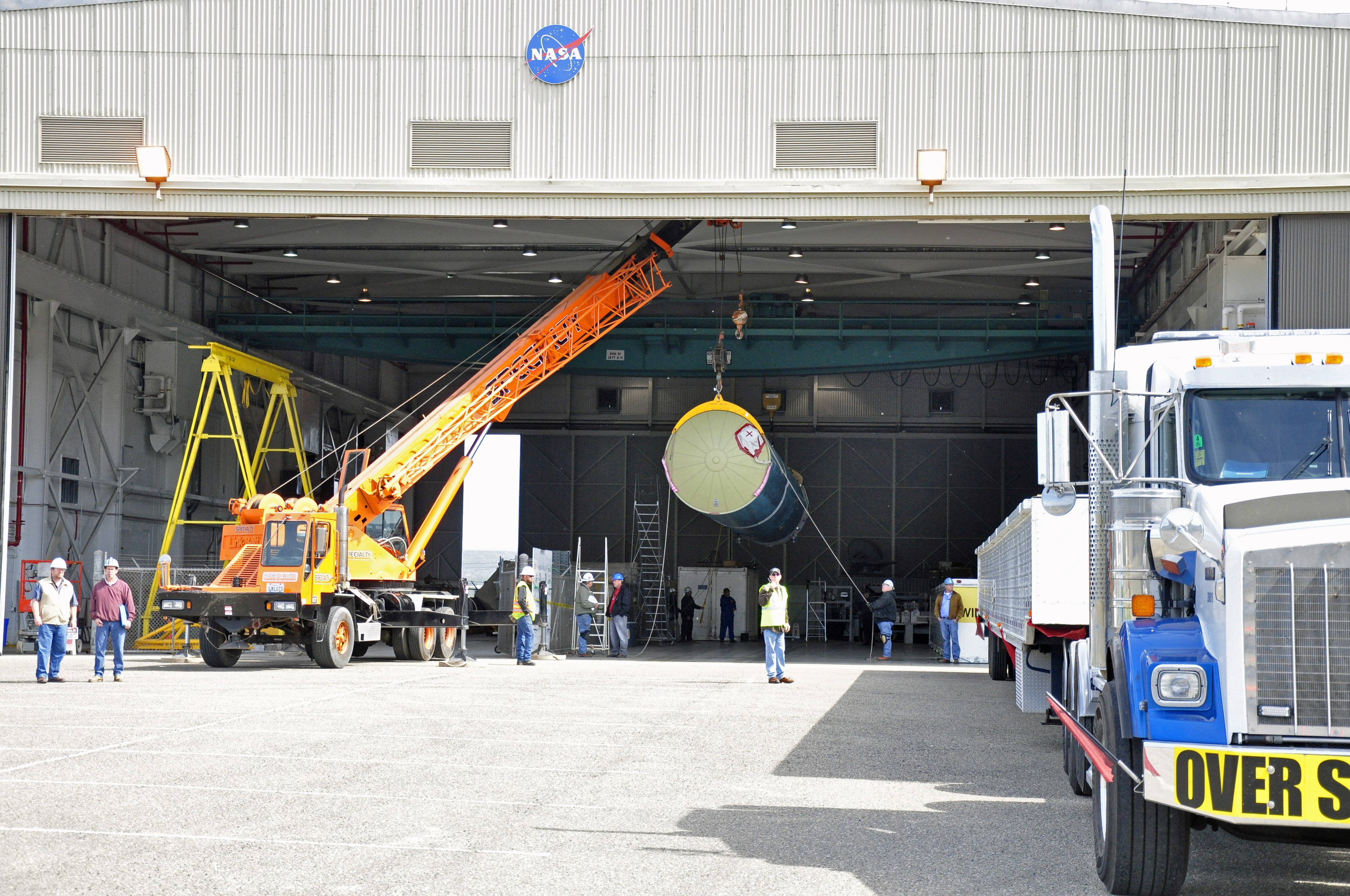 VANDENBERG AIR FORCE BASE, Calif. – The Delta first-stage booster for NASA's Orbiting Carbon Observatory-2 mission, or OCO-2, is suspended midair during its transfer from its transportation trailer to a transportation hardware cradle in the Building 836 hangar at Space Launch Complex 2 on Vandenberg Air Force Base in California. OCO-2 is scheduled to launch aboard a United Launch Alliance Delta II rocket in July. The observatory will collect precise global measurements of carbon dioxide in the Earth's atmosphere and provide scientists with a better idea of the chemical compound's impacts on climate change. Scientists will analyze this data to improve our understanding of the natural processes and human activities that regulate the abundance and distribution of this important atmospheric gas. To learn more about OCO-2, visit http://oco.jpl.nasa.gov. Photo credit: NASA/Randy Beaudoin