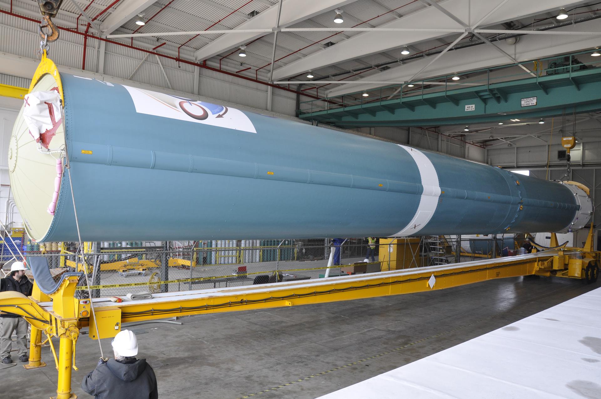 VANDENBERG AIR FORCE BASE, Calif. – The Delta first-stage booster for NASA's Orbiting Carbon Observatory-2 mission, or OCO-2, is lowered onto a transportation hardware cradle in the Building 836 hangar at Space Launch Complex 2 on Vandenberg Air Force Base in California. OCO-2 is scheduled to launch aboard a United Launch Alliance Delta II rocket in July. The observatory will collect precise global measurements of carbon dioxide in the Earth's atmosphere and provide scientists with a better idea of the chemical compound's impacts on climate change. Scientists will analyze this data to improve our understanding of the natural processes and human activities that regulate the abundance and distribution of this important atmospheric gas. To learn more about OCO-2, visit http://oco.jpl.nasa.gov. Photo credit: NASA/Randy Beaudoin