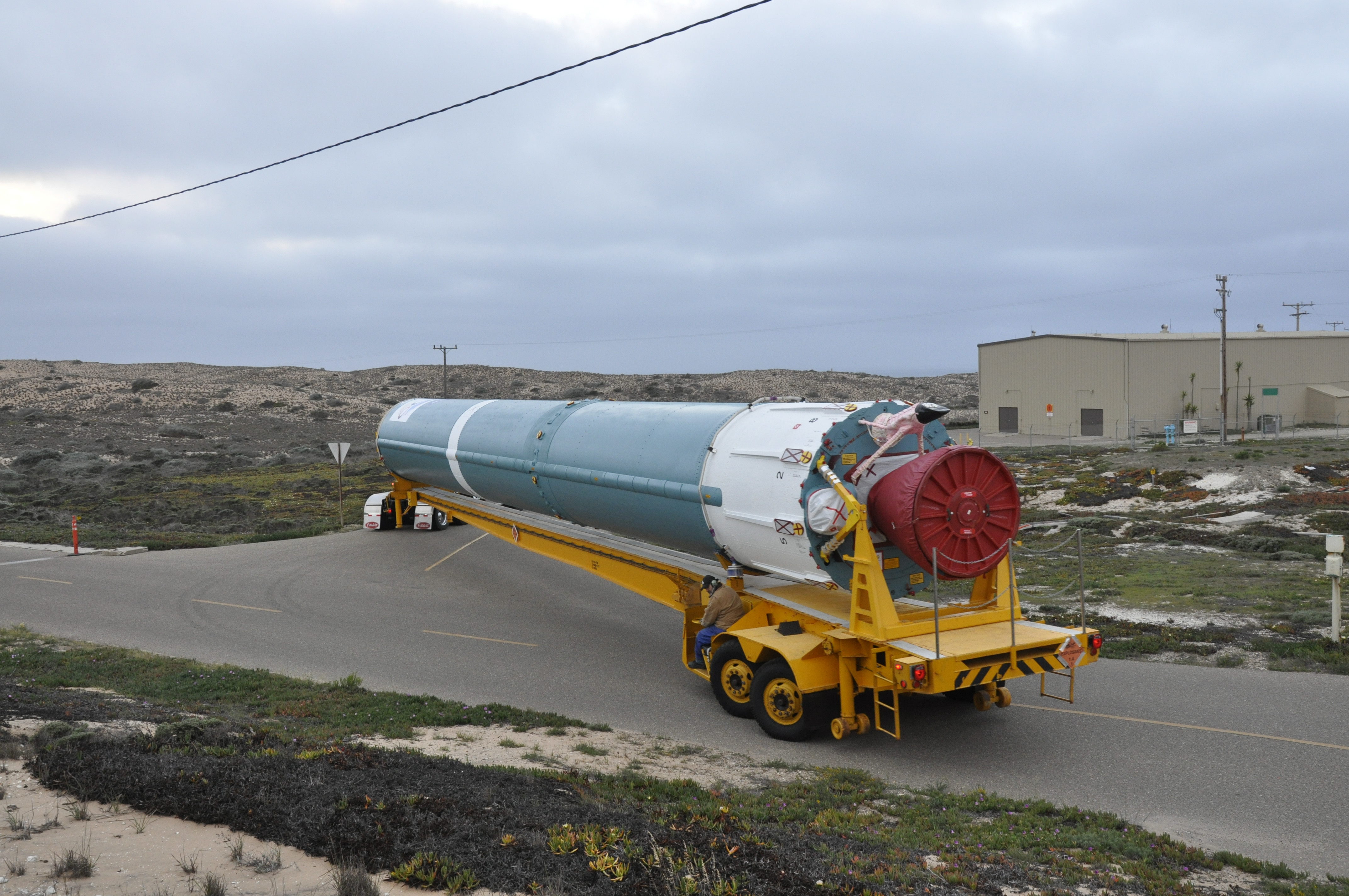VANDENBERG AIR FORCE BASE, Calif. – The Delta first-stage booster for NASA's Orbiting Carbon Observatory-2 mission, or OCO-2, arrives at the Horizontal Processing Facility at Space Launch Complex 2 on Vandenberg Air Force Base in California. OCO-2 is scheduled to launch aboard a United Launch Alliance Delta II rocket in July. The observatory will collect precise global measurements of carbon dioxide in the Earth's atmosphere and provide scientists with a better idea of the chemical compound's impacts on climate change. Scientists will analyze this data to improve our understanding of the natural processes and human activities that regulate the abundance and distribution of this important atmospheric gas. To learn more about OCO-2, visit http://oco.jpl.nasa.gov. Photo credit: NASA/Randy Beaudoin