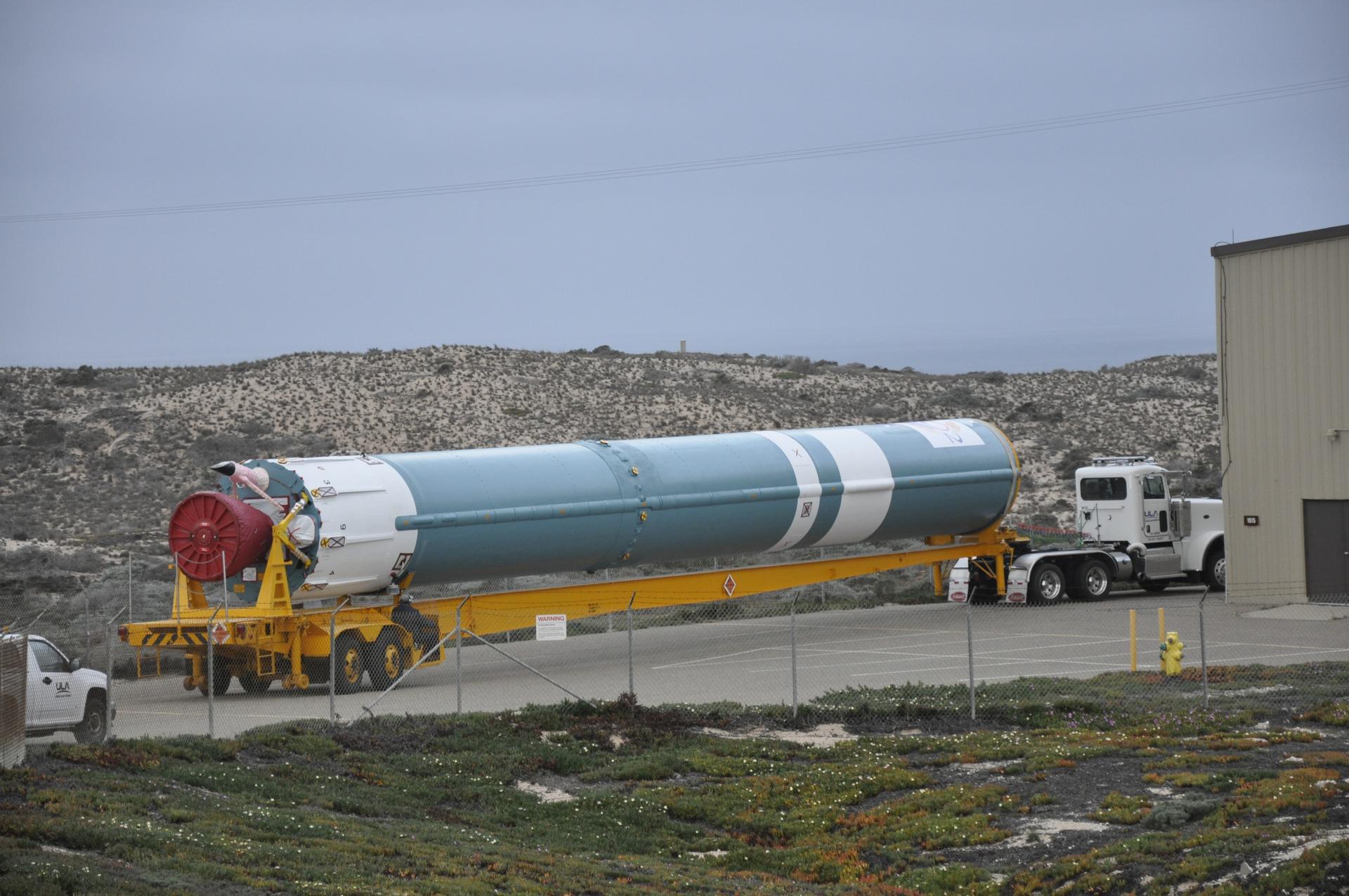 VANDENBERG AIR FORCE BASE, Calif. – The Delta first-stage booster for NASA's Orbiting Carbon Observatory-2 mission, or OCO-2, secured in a transportation hardware cradle, is towed to the Horizontal Processing Facility at Space Launch Complex 2 on Vandenberg Air Force Base in California. OCO-2 is scheduled to launch aboard a United Launch Alliance Delta II rocket in July. The observatory will collect precise global measurements of carbon dioxide in the Earth's atmosphere and provide scientists with a better idea of the chemical compound's impacts on climate change. Scientists will analyze this data to improve our understanding of the natural processes and human activities that regulate the abundance and distribution of this important atmospheric gas. To learn more about OCO-2, visit http://oco.jpl.nasa.gov. Photo credit: NASA/Randy Beaudoin