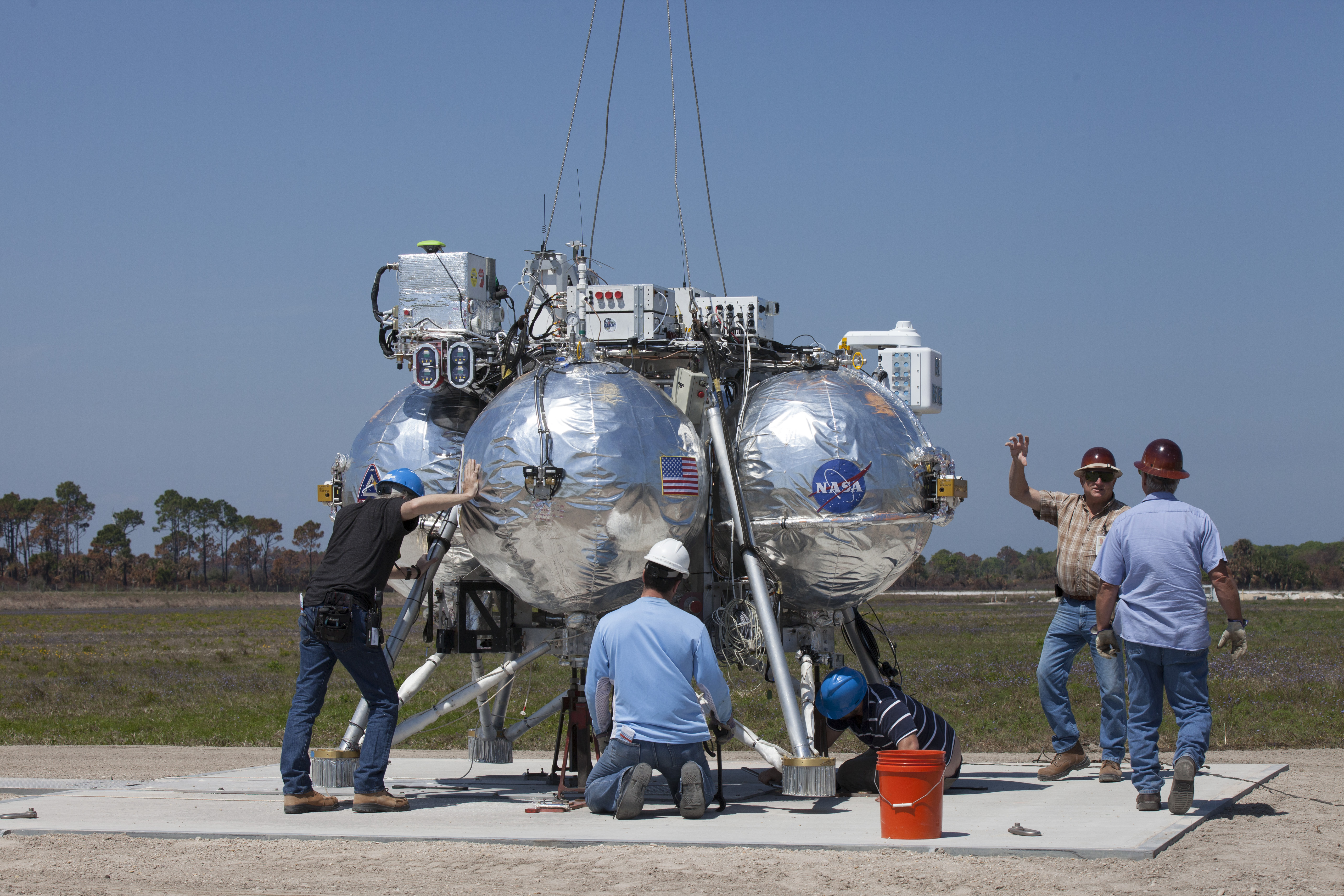 CAPE CANAVERAL, Fla. – Engineers and technicians prepare the Project Morpheus prototype lander for an automated landing and hazard avoidance technology, or ALHAT, and laser test at a new launch site at the north end of the Shuttle Landing Facility at NASA’s Kennedy Space Center in Florida. The launch pad was moved to a different location at the landing facility to support the next phase of flight testing. The seventh free flight test of Morpheus occurred on March 11. The 83-second test began at 3:41 p.m. EDT with the Morpheus lander launching from the ground over a flame trench and ascending to 580 feet. Morpheus then flew its fastest downrange trek at 30 mph, travelling farther than before, 837 feet. The lander performed a 42-foot divert to emulate a hazard avoidance maneuver before descending and touching down on Landing Site 2, at the northern landing pad inside the ALHAT hazard field. Morpheus landed within one foot of its intended target. Project Morpheus tests NASA’s ALHAT and an engine that runs on liquid oxygen and methane, or green propellants, into a fully-operational lander that could deliver cargo to other planetary surfaces. The landing facility provides the lander with the kind of field necessary for realistic testing, complete with rocks, craters and hazards to avoid. Morpheus’ ALHAT payload allows it to navigate to clear landing sites amidst rocks, craters and other hazards during its descent. Project Morpheus is being managed under the Advanced Exploration Systems, or AES, Division in NASA’s Human Exploration and Operations Mission Directorate. The efforts in AES pioneer new approaches for rapidly developing prototype systems, demonstrating key capabilities and validating operational concepts for future human missions beyond Earth orbit. For more information on Project Morpheus, visit http://morpheuslander.jsc.nasa.gov/. Photo credit: NASA/Kim Shiflett