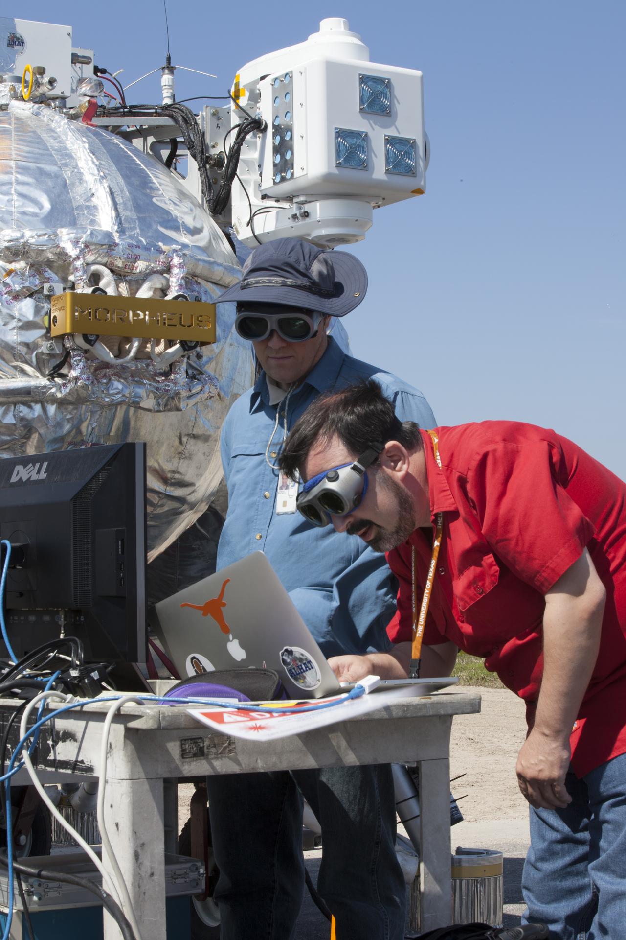 CAPE CANAVERAL, Fla. – Engineers and technicians prepare the Project Morpheus prototype lander for an automated landing and hazard avoidance technology, or ALHAT, and laser test at a new launch site at the north end of the Shuttle Landing Facility at NASA’s Kennedy Space Center in Florida. The launch pad was moved to a different location at the landing facility to support the next phase of flight testing. The seventh free flight test of Morpheus occurred on March 11. The 83-second test began at 3:41 p.m. EDT with the Morpheus lander launching from the ground over a flame trench and ascending to 580 feet. Morpheus then flew its fastest downrange trek at 30 mph, travelling farther than before, 837 feet. The lander performed a 42-foot divert to emulate a hazard avoidance maneuver before descending and touching down on Landing Site 2, at the northern landing pad inside the ALHAT hazard field. Morpheus landed within one foot of its intended target. Project Morpheus tests NASA’s ALHAT and an engine that runs on liquid oxygen and methane, or green propellants, into a fully-operational lander that could deliver cargo to other planetary surfaces. The landing facility provides the lander with the kind of field necessary for realistic testing, complete with rocks, craters and hazards to avoid. Morpheus’ ALHAT payload allows it to navigate to clear landing sites amidst rocks, craters and other hazards during its descent. Project Morpheus is being managed under the Advanced Exploration Systems, or AES, Division in NASA’s Human Exploration and Operations Mission Directorate. The efforts in AES pioneer new approaches for rapidly developing prototype systems, demonstrating key capabilities and validating operational concepts for future human missions beyond Earth orbit. For more information on Project Morpheus, visit http://morpheuslander.jsc.nasa.gov/. Photo credit: NASA/Kim Shiflett