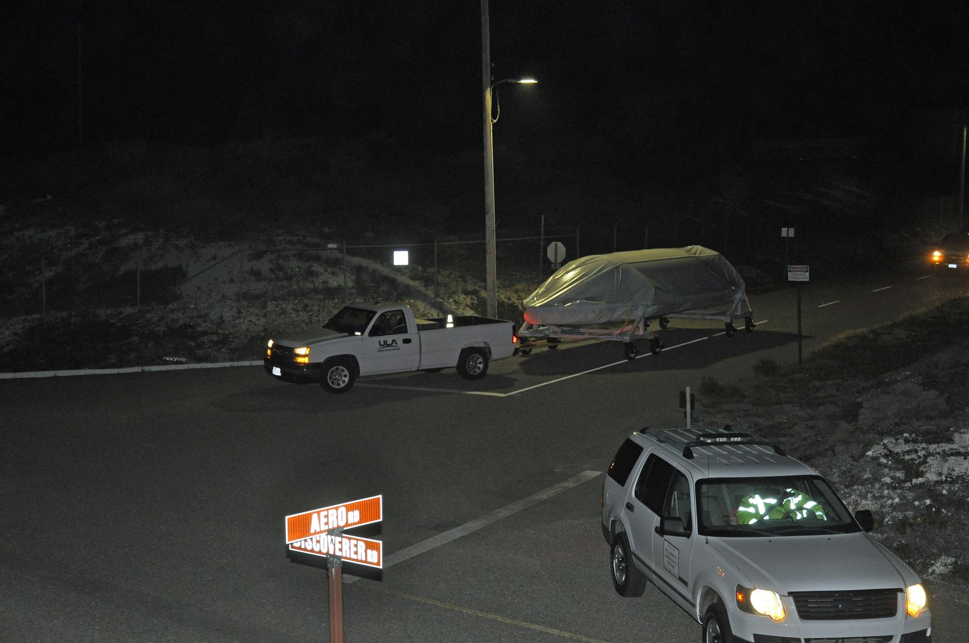 VANDENBERG AIR FORCE BASE, Calif. – Half of the fairing for NASA's Orbiting Carbon Observatory-2 mission, or OCO-2, is towed from the Building 836 hangar to Space Launch Complex 2 on Vandenberg Air Force Base in California. Operations have begun to hoist the sections of the fairing into the Delta II launcher's environmental enclosure, or clean room, at the top of the pad's tower. The fairing will protect OCO-2 during launch aboard a United Launch Alliance Delta II rocket from Space Launch Complex 2 in July. The observatory will collect precise global measurements of carbon dioxide in the Earth's atmosphere and provide scientists with a better idea of the chemical compound's impacts on climate change. Scientists will analyze this data to improve our understanding of the natural processes and human activities that regulate the abundance and distribution of this important atmospheric gas. To learn more about OCO-2, visit http://oco.jpl.nasa.gov. Photo credit: NASA/Randy Beaudoin