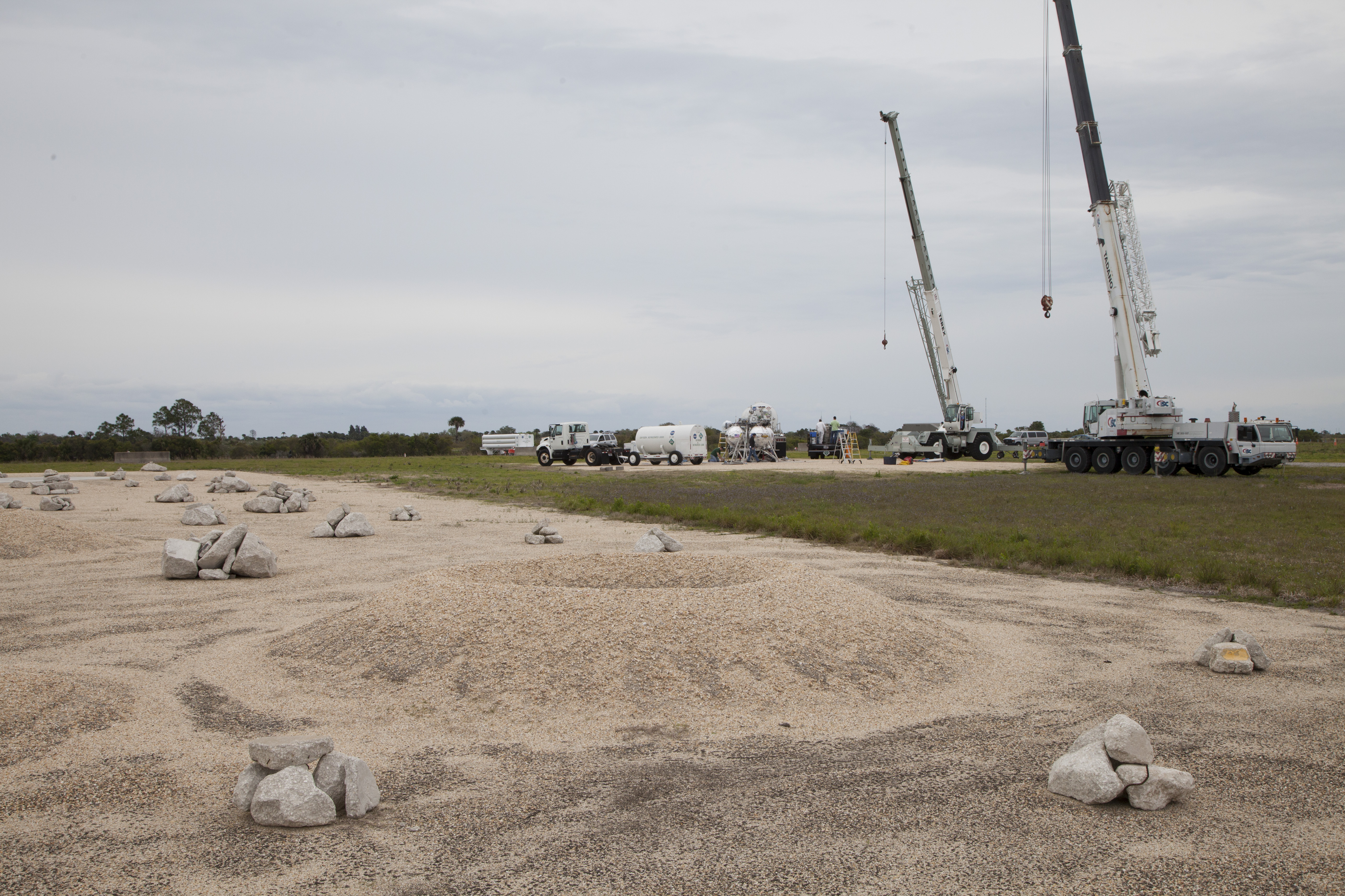 CAPE CANAVERAL, Fla. – NASA's Project Morpheus prototype lander is positioned near a new launch site at the north end of the Shuttle Landing Facility at NASA’s Kennedy Space Center in Florida for a tether test. The launch pad was moved to a different location at the landing facility to support the next phase of flight testing. Project Morpheus tests NASA’s automated landing and hazard avoidance technology, or ALHAT, and an engine that runs on liquid oxygen and methane, or green propellants, into a fully-operational lander that could deliver cargo to other planetary surfaces. In the foreground of the photo is the ALHAT field. The landing facility provides the lander with the kind of field necessary for realistic testing, complete with rocks, craters and hazards to avoid. Morpheus’ ALHAT payload allows it to navigate to clear landing sites amidst rocks, craters and other hazards during its descent. Project Morpheus is being managed under the Advanced Exploration Systems, or AES, Division in NASA’s Human Exploration and Operations Mission Directorate. The efforts in AES pioneer new approaches for rapidly developing prototype systems, demonstrating key capabilities and validating operational concepts for future human missions beyond Earth orbit. For more information on Project Morpheus, visit http://morpheuslander.jsc.nasa.gov/. Photo credit: NASA/Ben Smegelsky